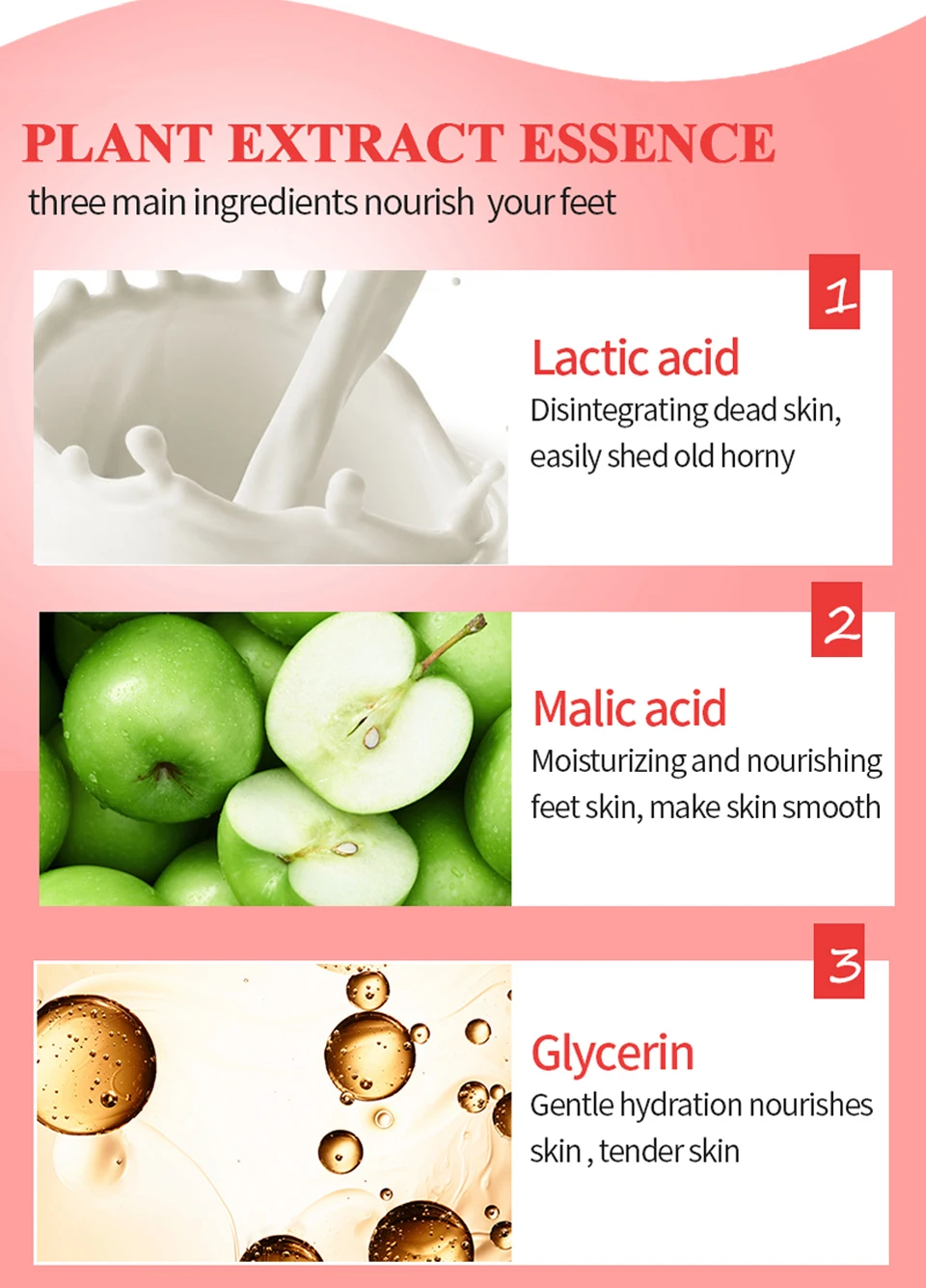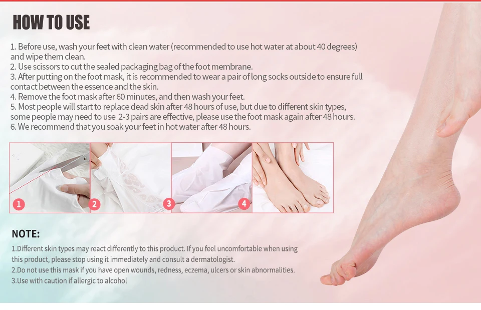 1. Перед использованием Вымойте ноги чистой водой (рекомендуется использовать горячую воду при температуре около 40 градусов) и протрите их чистой.2. Используйте ножницы, чтобы разрезать герметичный упаковочный пакет с мембраной для ног.3. После нанесения маски для ног рекомендуется носить пару длинных носков на улице, чтобы полностью соприкоснуться с эссенцией и кожей.4. Снимите маску для ног через 60 минут, а затем Вымойте ноги.5. Большинство людей начнут заменять омертвевшую кожу после 48 часов использования, но из-за разных типов кожи некоторые люди могут эффективно использовать 2-3 пары, пожалуйста, используйте маску для ног снова через 48 часов.6. Мы рекомендуем замочить ноги в горячей воде через 48 часов.