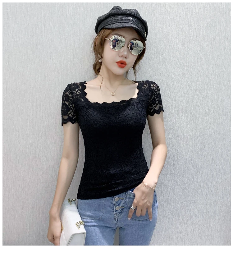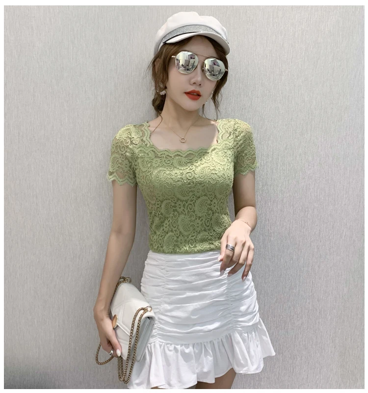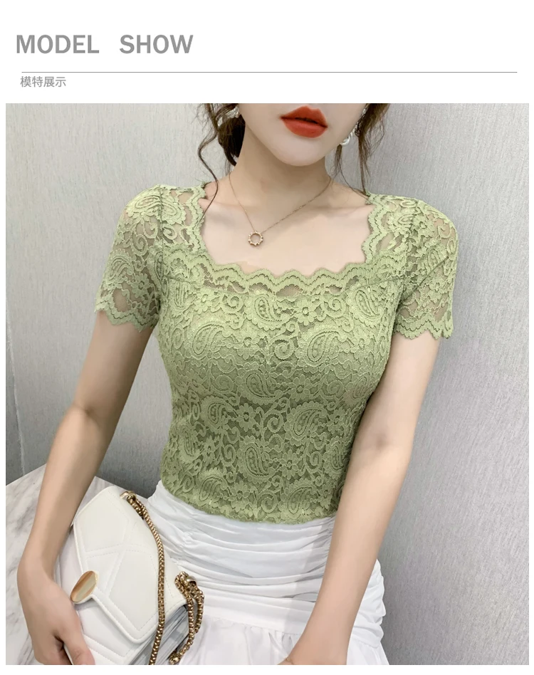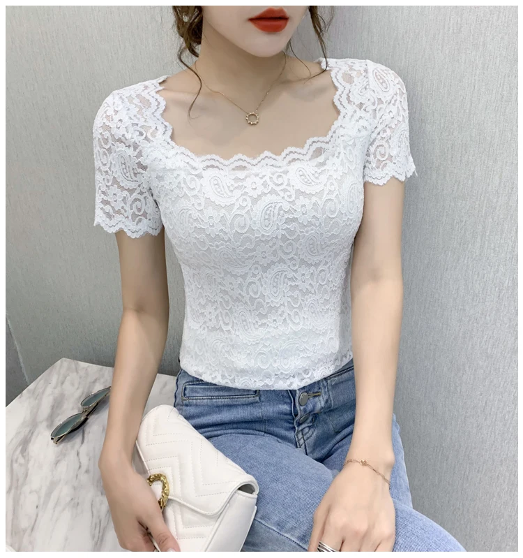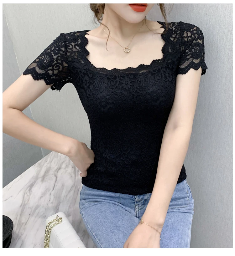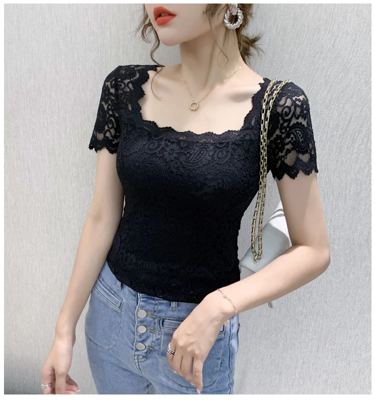 Женская Кружевная футболка, однотонная летняя блуза с коротким рукавом, рубашка с квадратным воротником