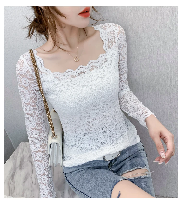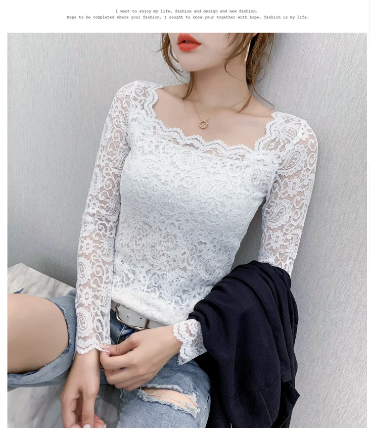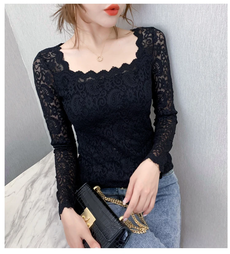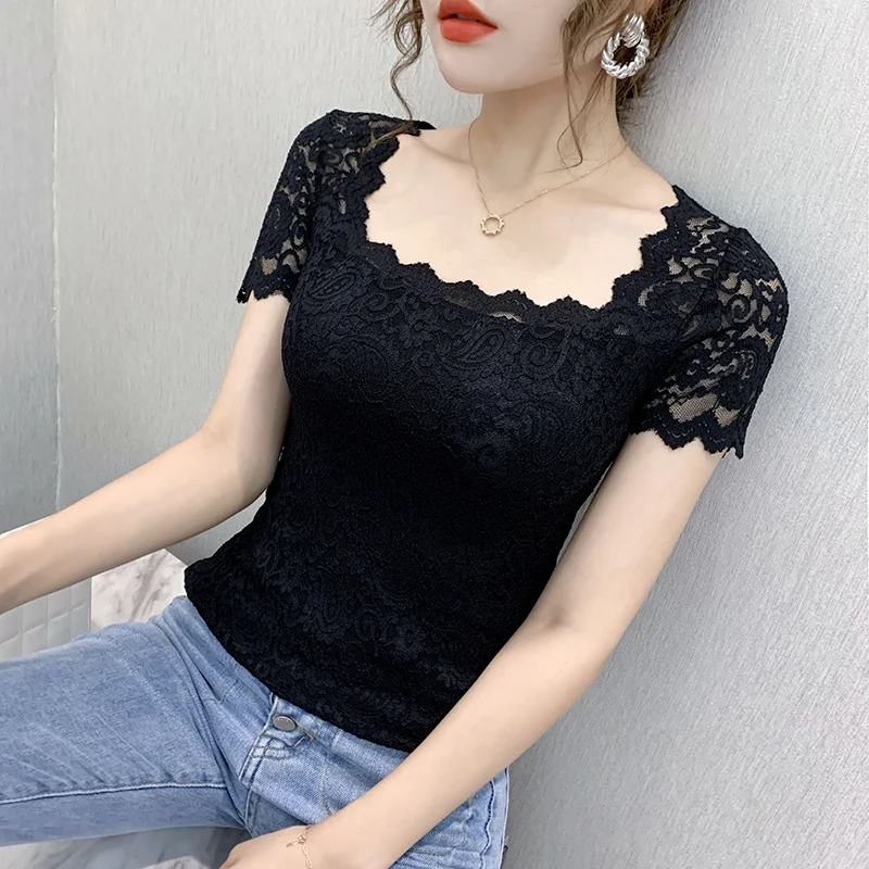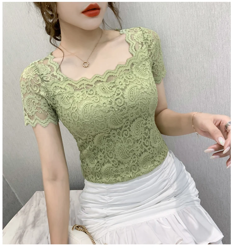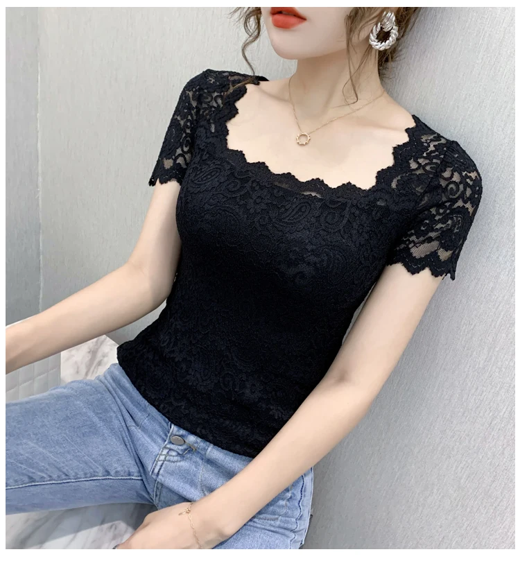 Женская Кружевная футболка, однотонная летняя блуза с коротким рукавом, рубашка с квадратным воротником