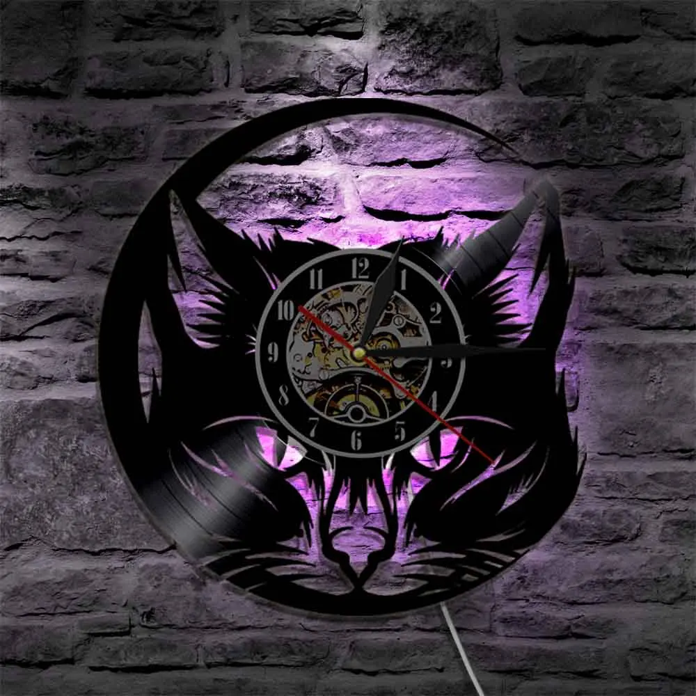 Настенные часы с изображением головы кошки, светящиеся светодиодные светильники с рисунком черной кошки и виниловой пластиной в современном стиле, для украшения гостиной, подарок