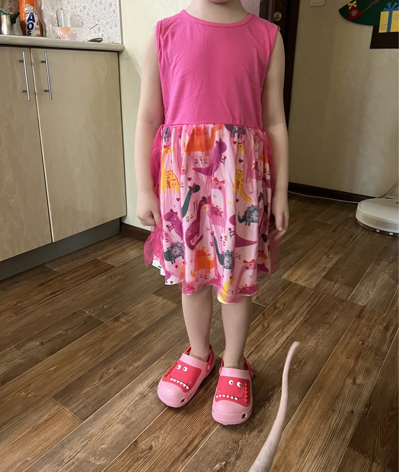 Доставка до Брянска месяц. Тюль длиннее подклада, пышная . 4т будет хорошо на 3 года. Верх хлопок, может примесь небольшая, ткань с динозаврами нет. Но за свои деньги отличное платье. Можно носить.