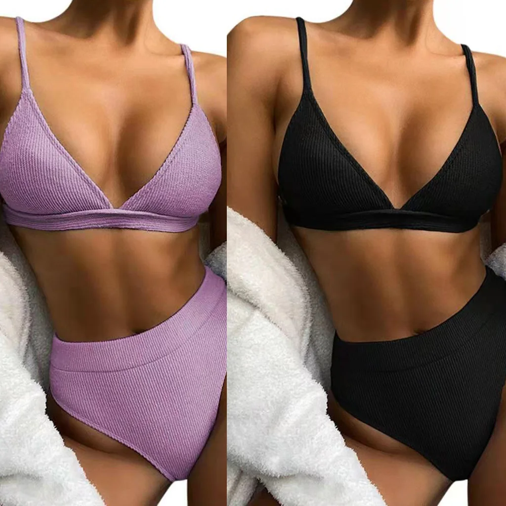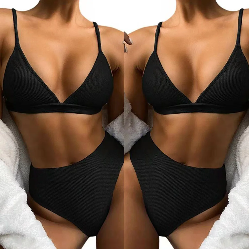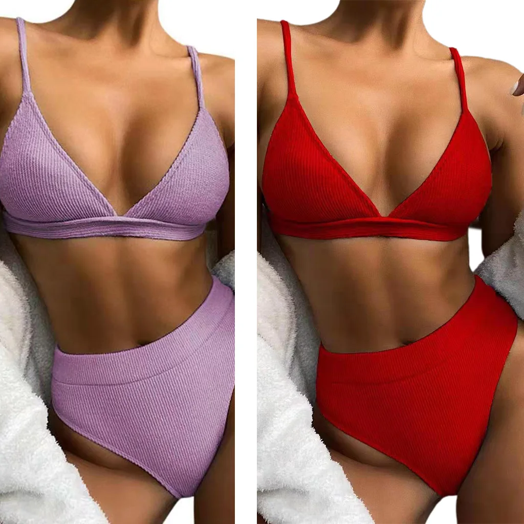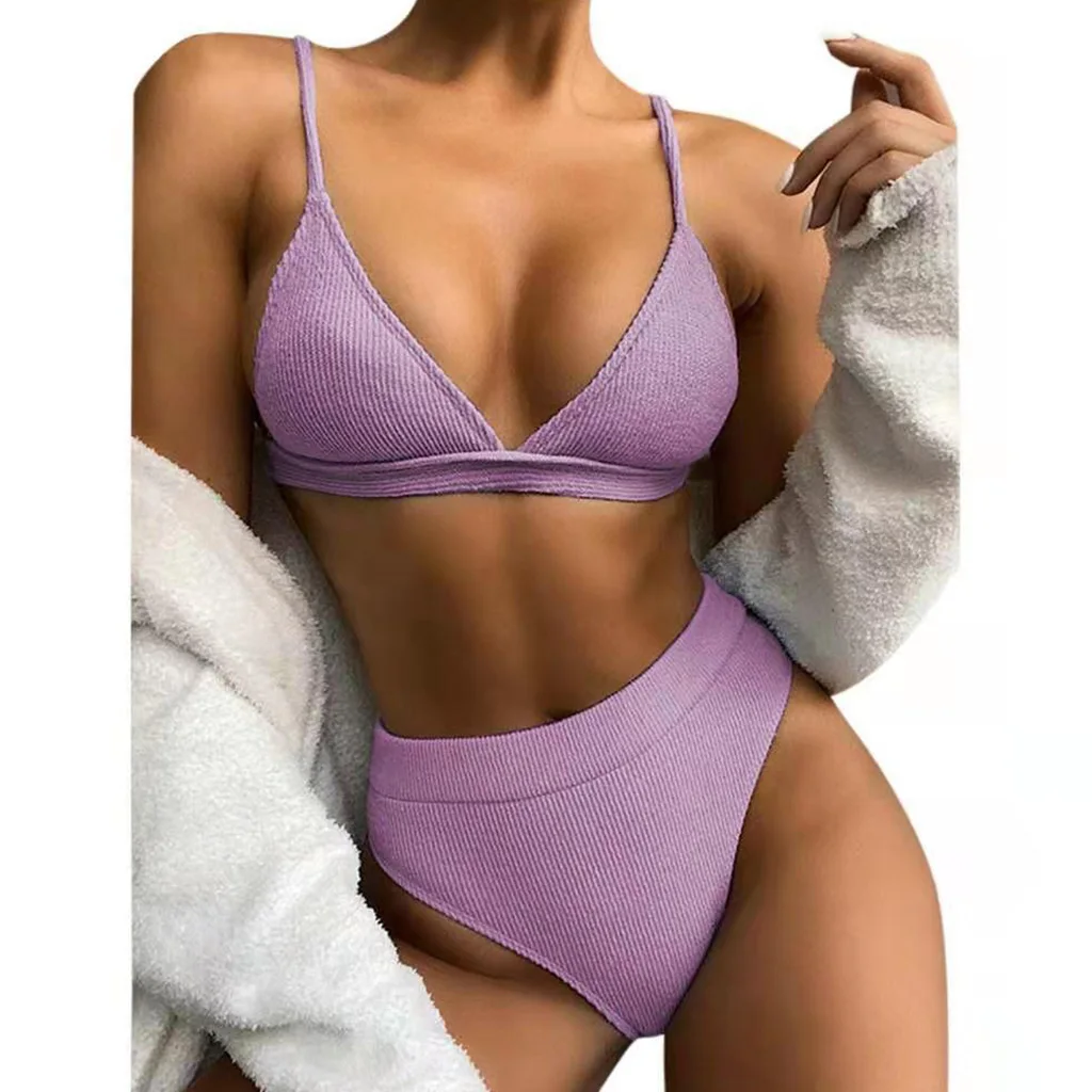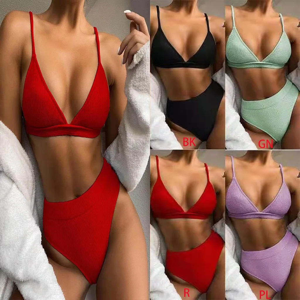 Женский пикантный комплект бикини из 2 предметов, однотонный треугольный купальник в рубчик в полоску, бразильский купальник с высокой талией, пуш-ап, купальный костюм с подкладкой