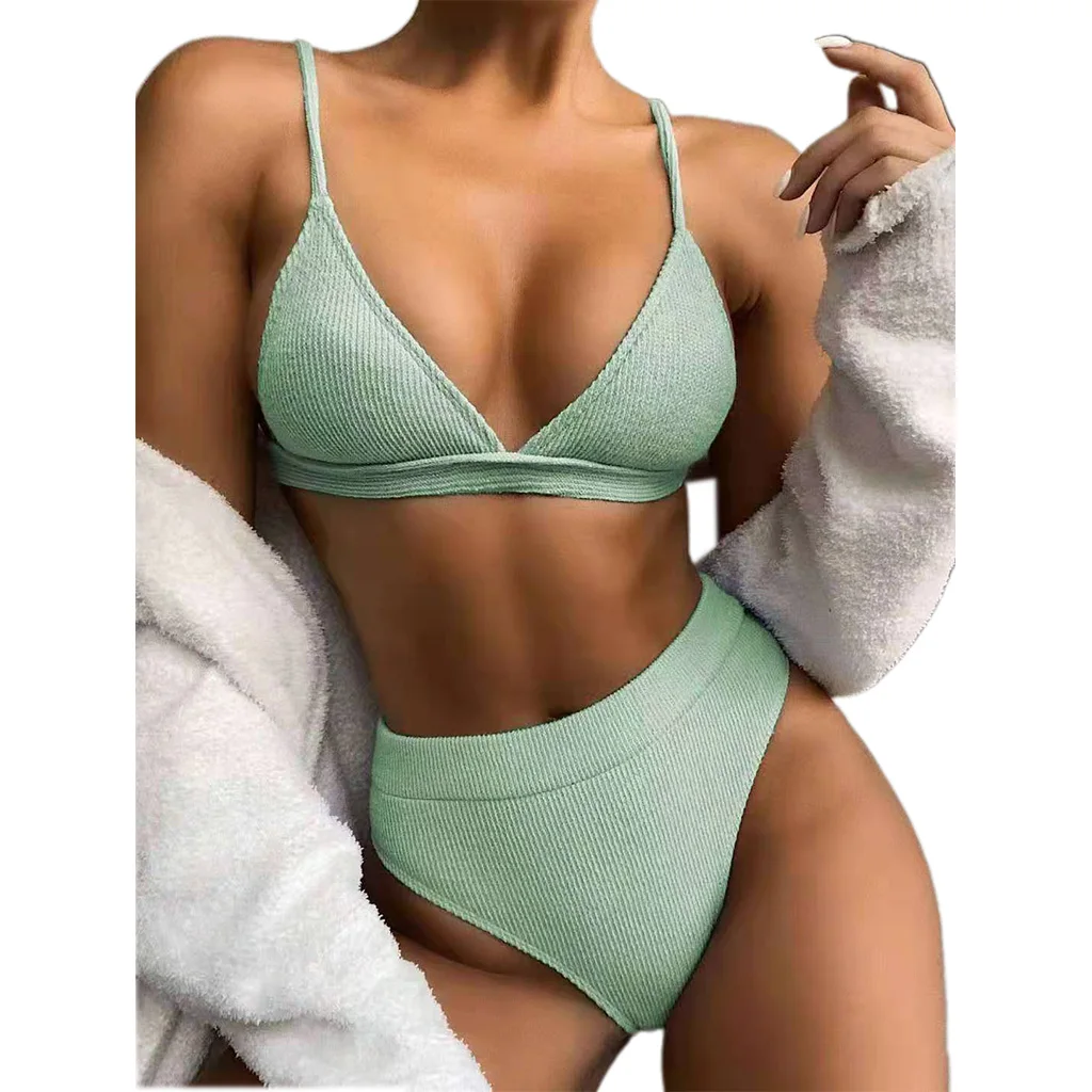 Женский сексуальный комплект бикини из 2 предметов, ребристый полосатый однотонный треугольный бразильский купальник с высокой талией, пуш-ап, купальный костюм с подкладкой
