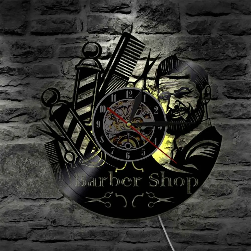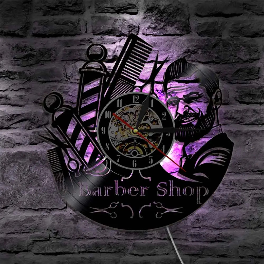 Настенные часы для парикмахера, уход за волосами, виниловая пластина, на батарейках, модный декоративный светодиодный светильник для парикмахера, подарок