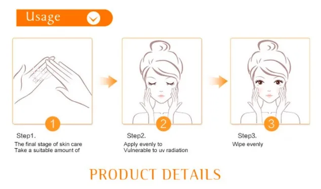 Как использовать:1. Перед выходом. Очистите лицо и увлажните его. 2. Равномерно нанесите необходимое количество продукта на лоб. Лицо. Нос. Подбородок и другие открытые области. 3. Нанесите небольшое количество продукта равномерно на шею. 4. Равномерно нанесите нужное количество продукта на руки. Руки и другие открытые места. 5.при ношении юбки или шорт. Нанесите необходимое количество продукта на ноги, которые будут подвержены сумме.Характеристики:Вперед, чтобы охватить солнечный свет. Во время путешествия. Лучше увеличивать количество или повторно применять в обычное время. Светильник и увлажняющий крем не стимулируют и обеспечивают превосходную защиту от солнечных ожогов и старения кожи, вызванных солнцем. Поместите необходимое количество продукта в ладонь и равномерно распределите его на лицо. Шея и другие части будут подвержены воздействию солнца