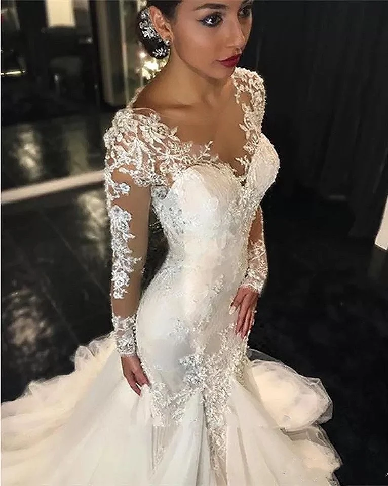 2021 Великолепное Кружевное Свадебное платье с юбкой-годе, Дубайский Африканский арабский с кожаным верхом, маленькие облегающие Свадебные платья с длинным рукавом рыбий хвост