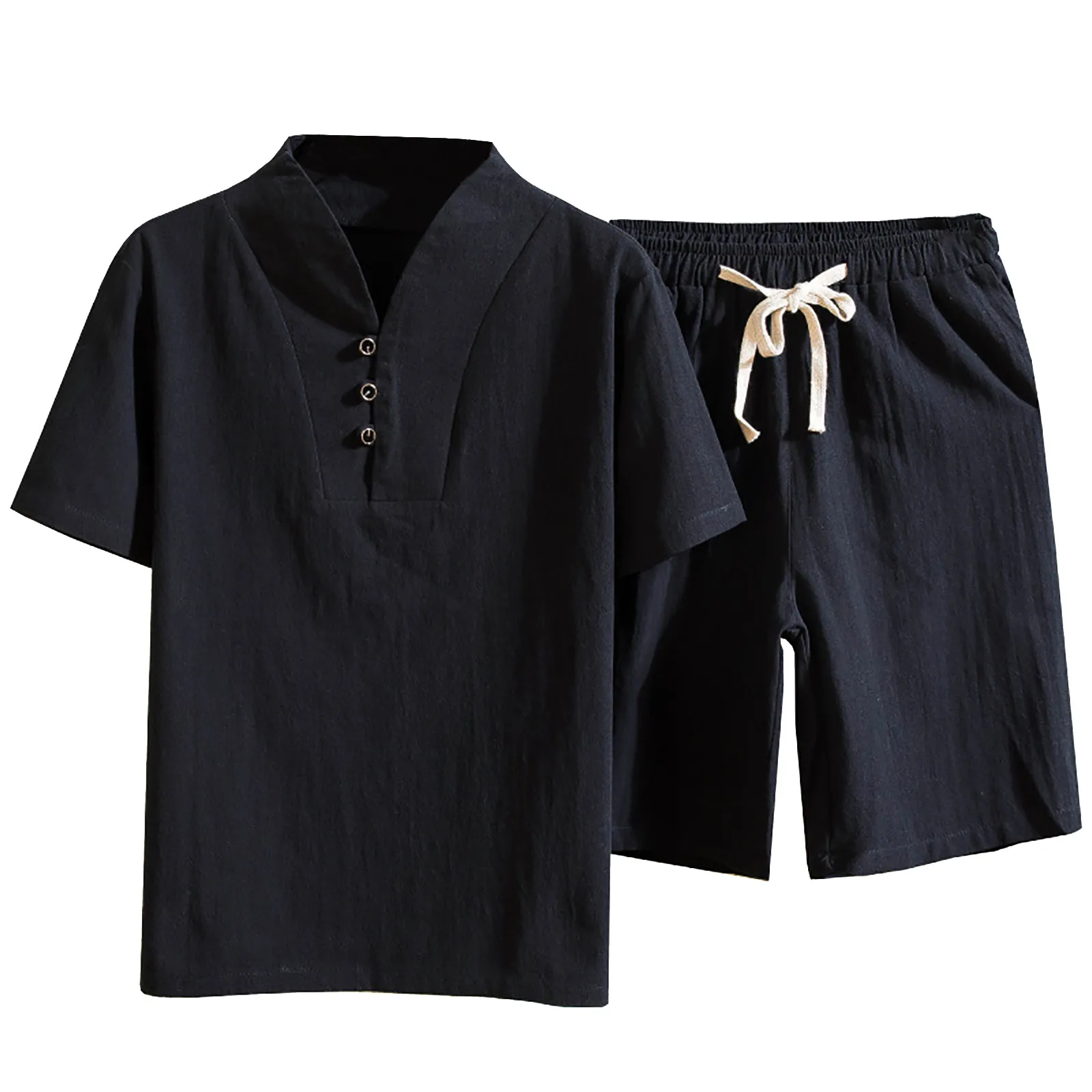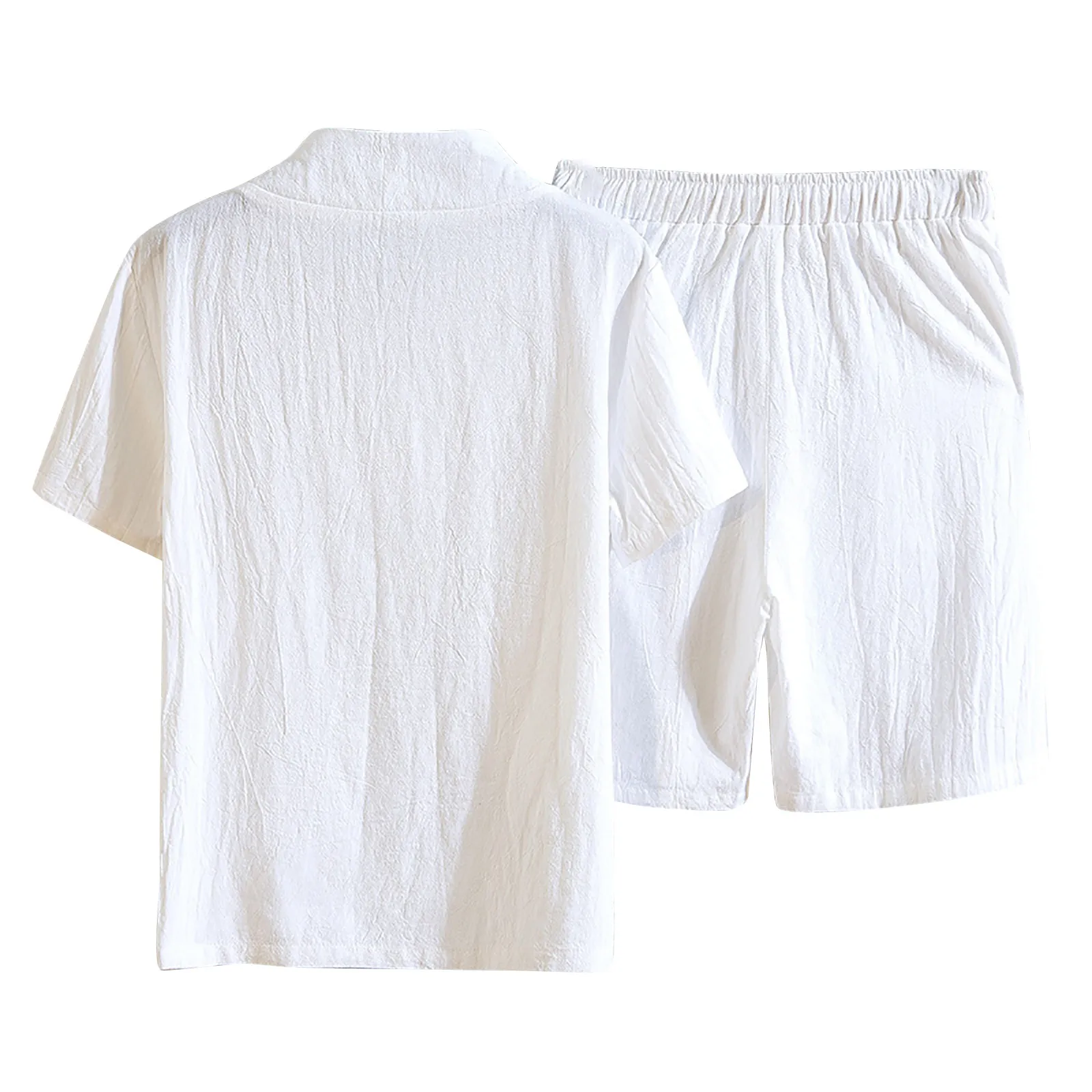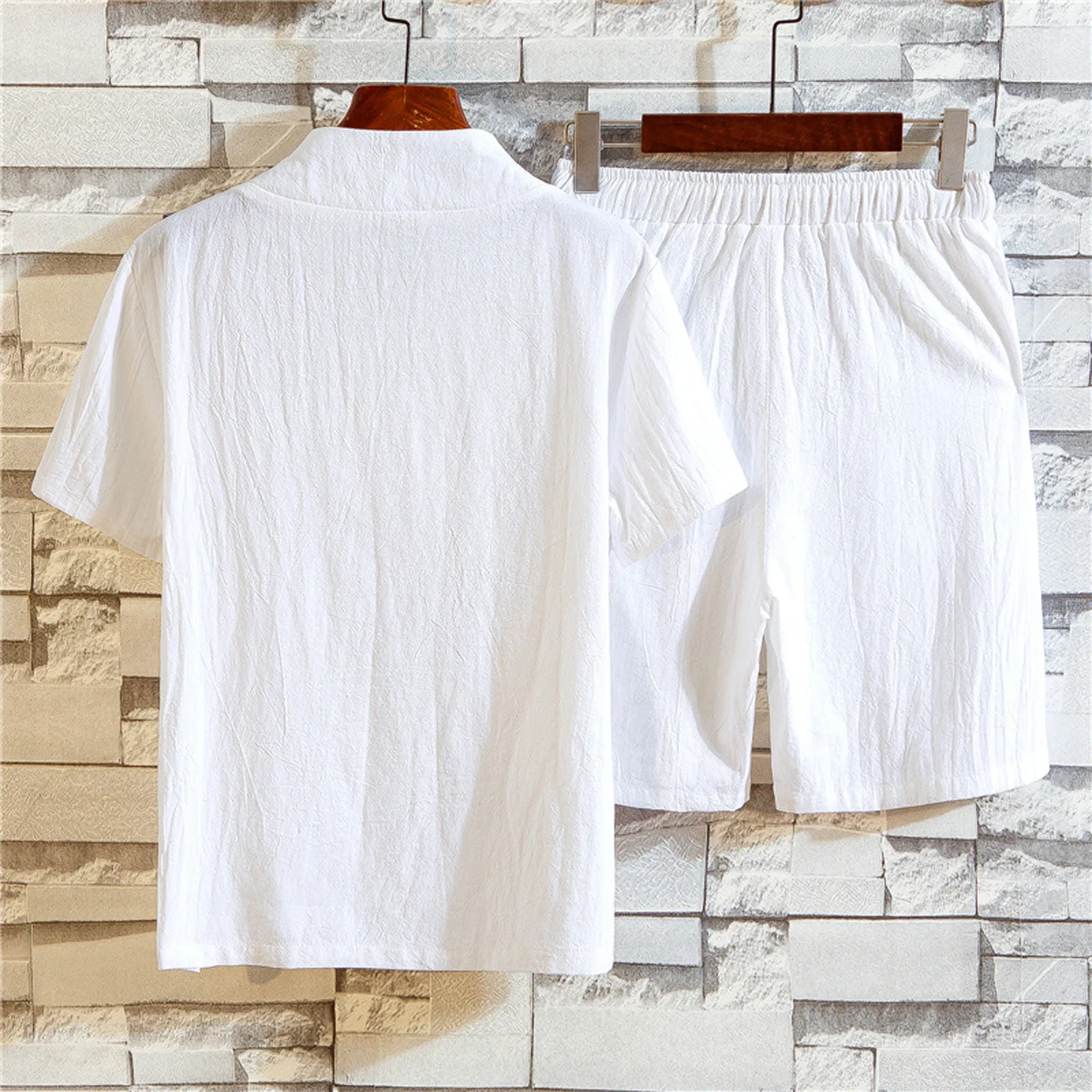 Костюм спортивный мужской однотонный в китайском стиле, льняная рубашка, шорты с коротким рукавом, удобный летний комплект из двух предметов, # g36