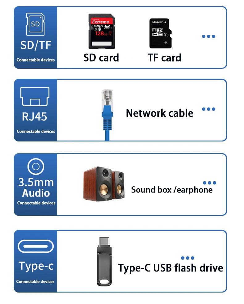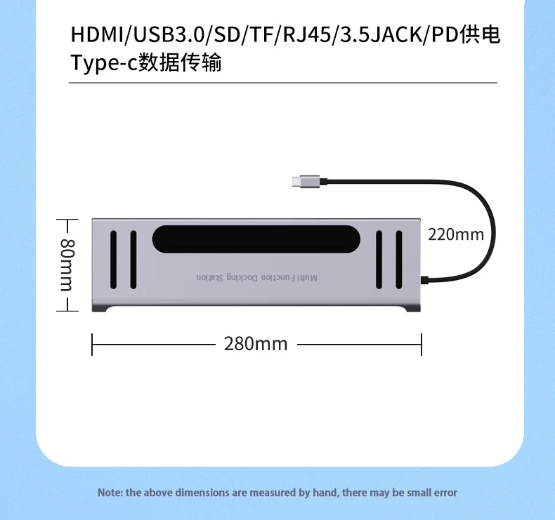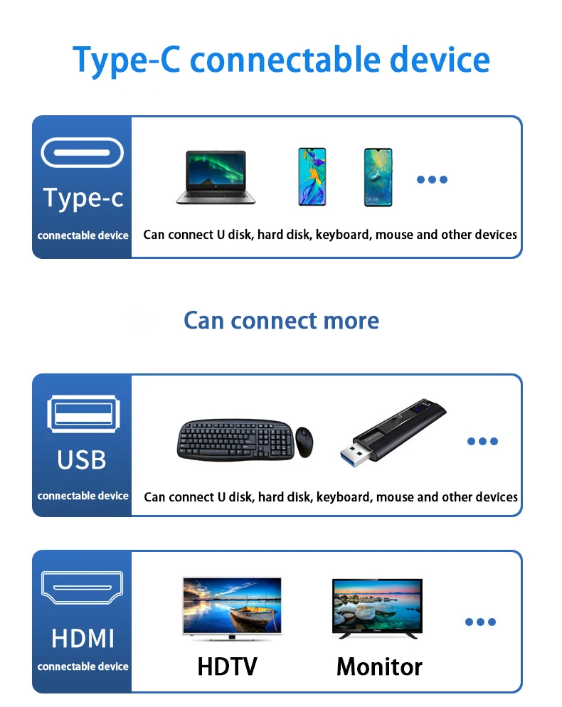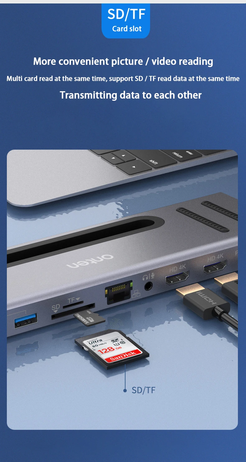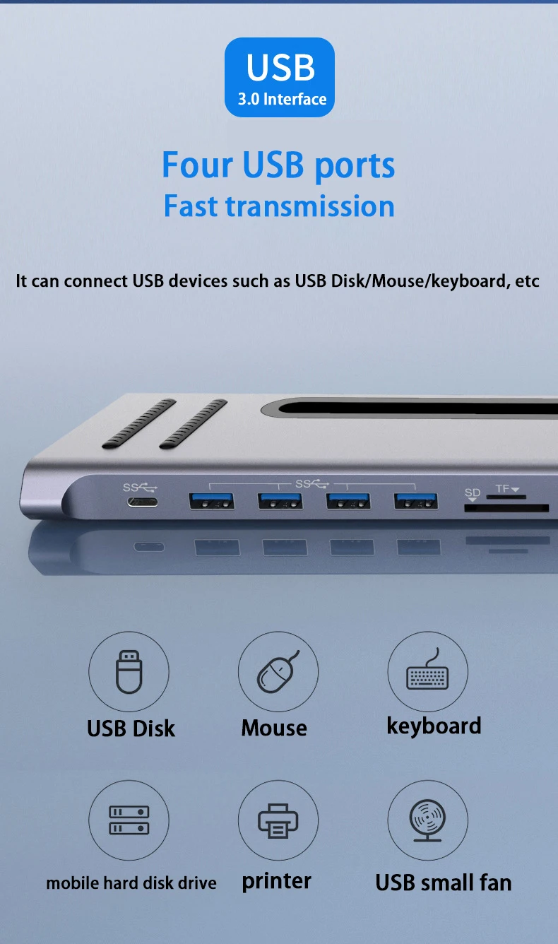 Порты: USB-C (PD male)× 1, USB 3,0 × 4, USB-C × 2, SD× 1, TF× 1, HDTV× 2, RJ 45 × 1, 3,5 мм JACK× 1