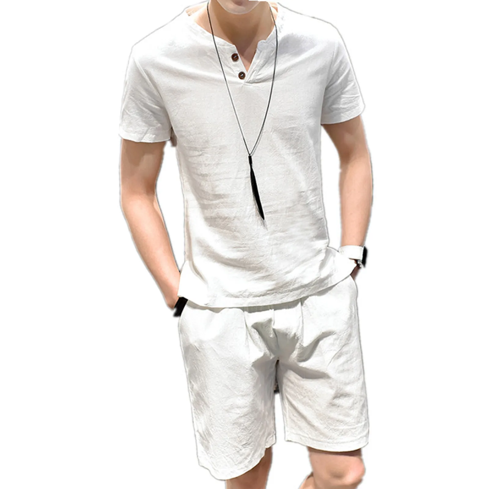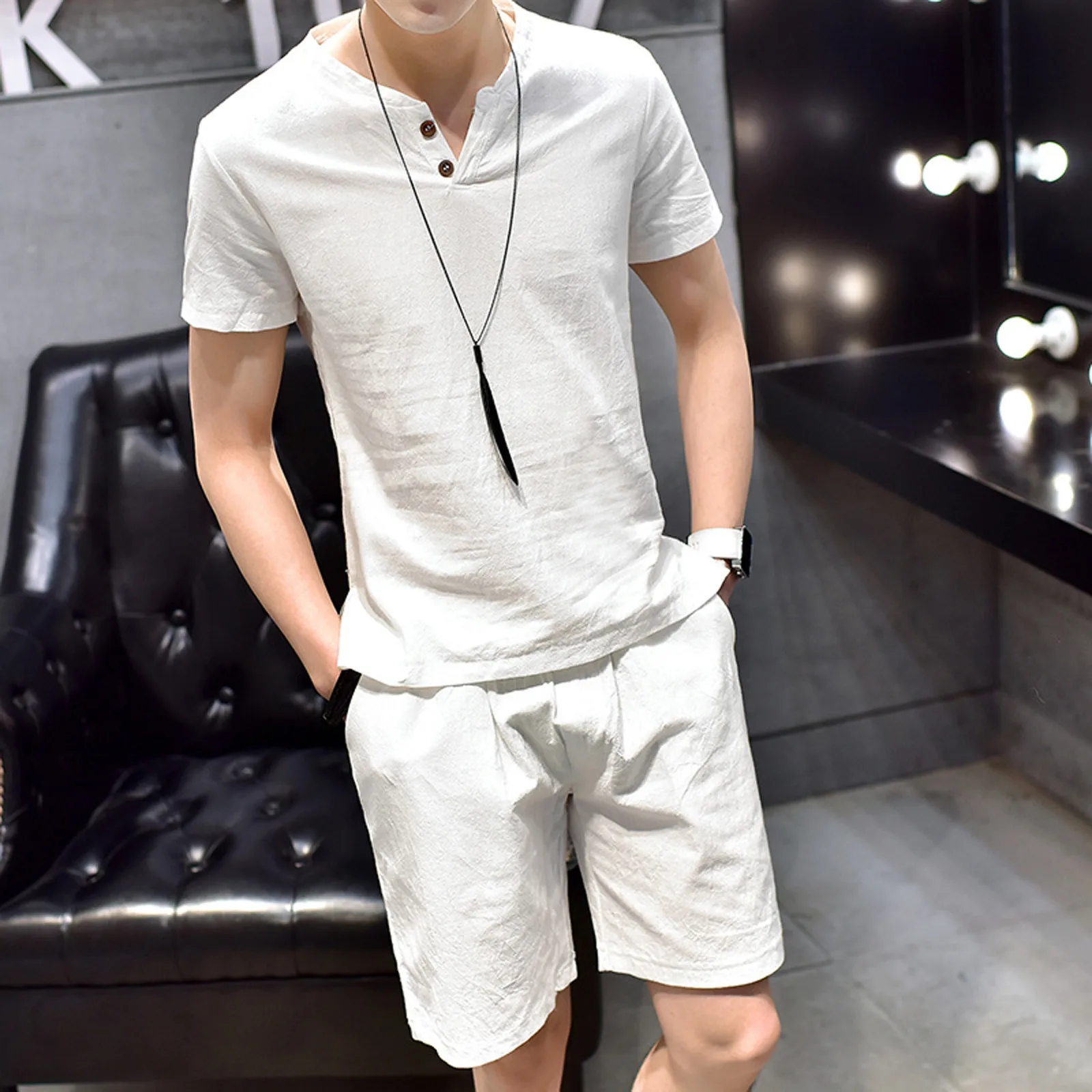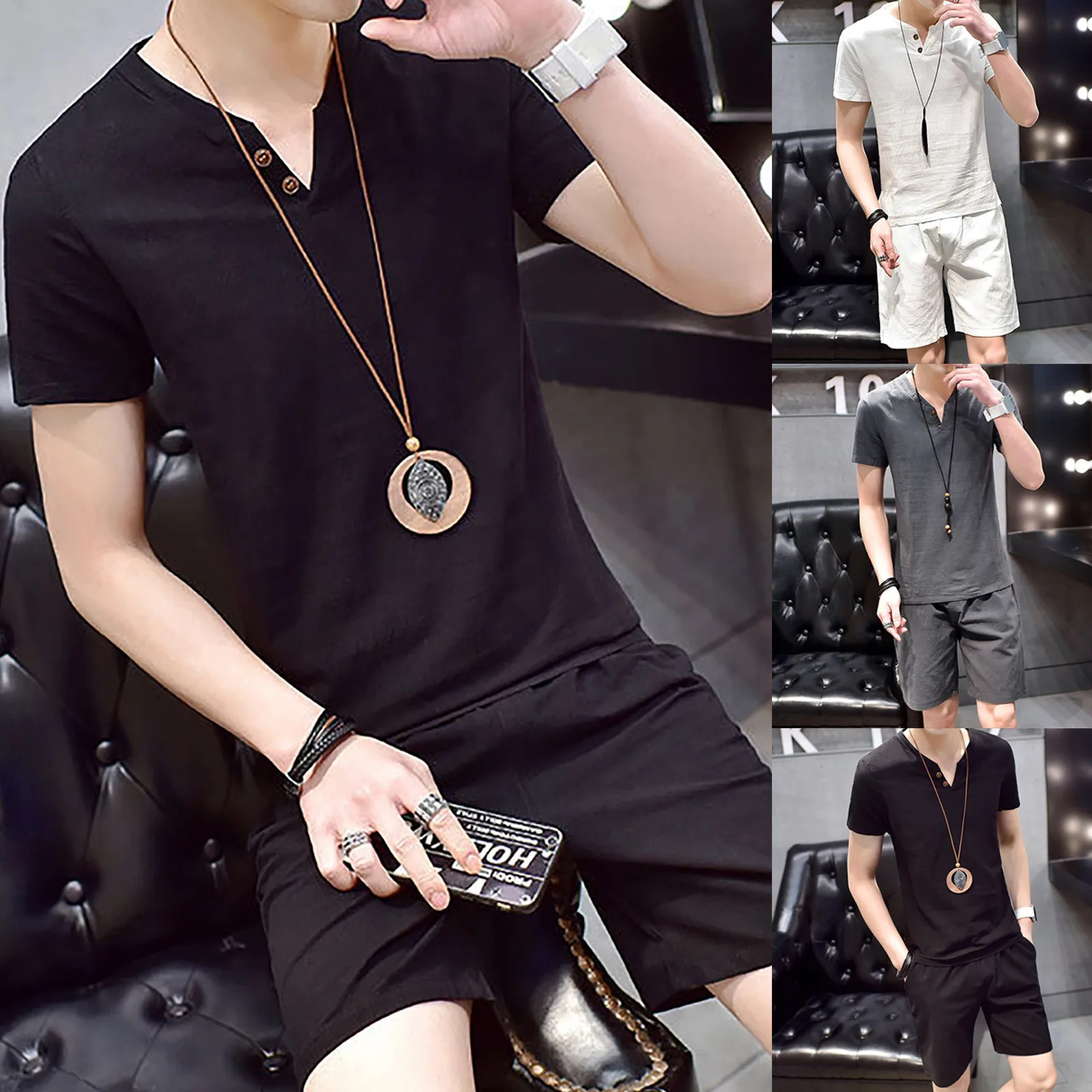 Комплект мужской футболки, Модный летний костюм, льняная футболка, модный мужской комплект, рубашка с коротким рукавом и V-образным вырезом, брюки, мужские комплекты
