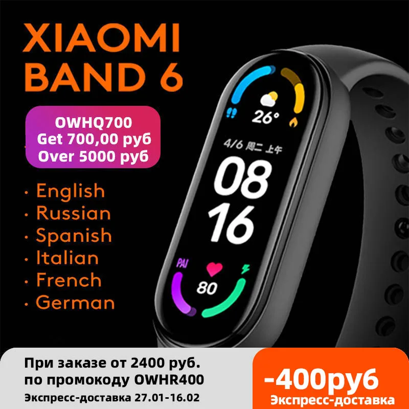 Смарт-браслет Xiaomi Mi Band 6, водонепроницаемый, с кислородом в крови, с AMOLED-экраном