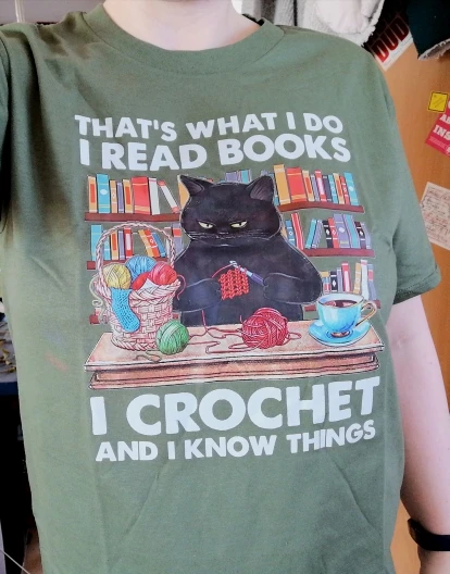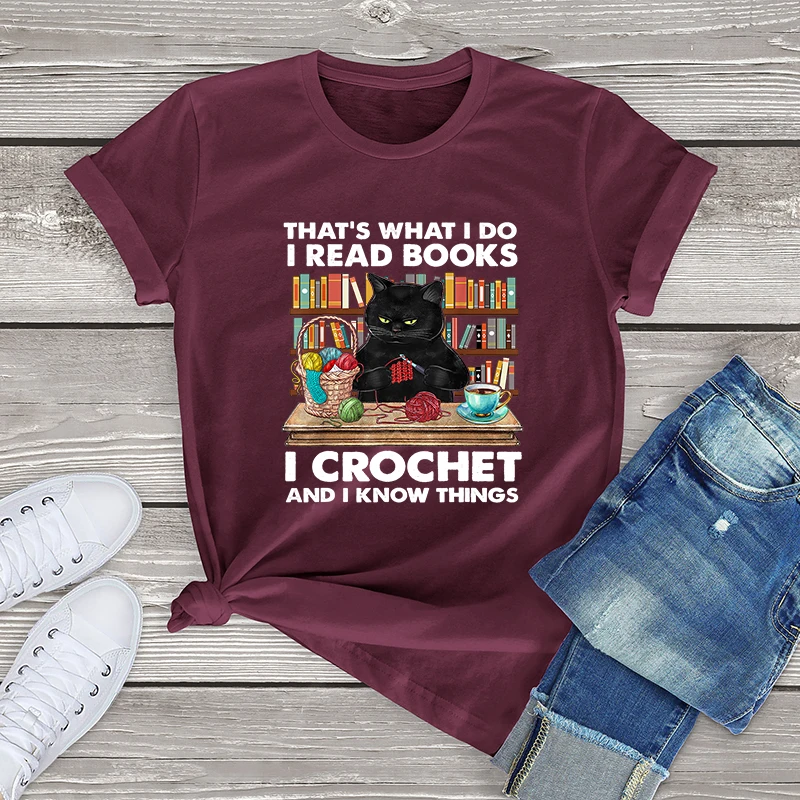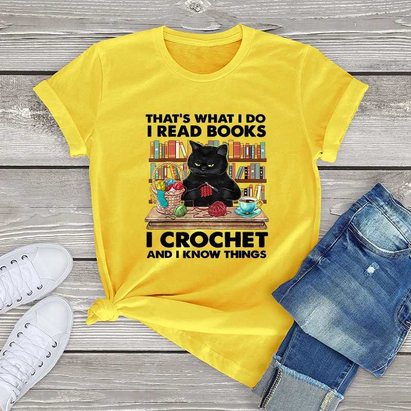 Вот что я делаю, я читаю книги, вязание крючком, и я знаю вещь, футболка, женская одежда, забавная черная футболка с котом, женские модные топы для девочек
