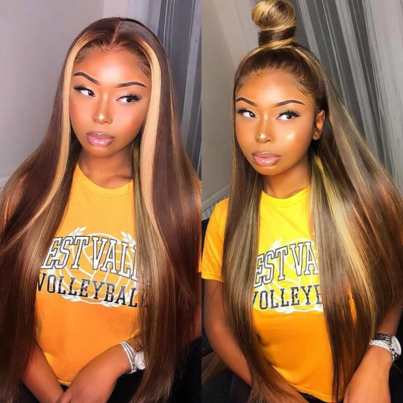 Malaika13X4 Выделите Синтетические волосы на кружеве парик с прямыми парики из натуральных волос на кружевной Мёд наращивания блонд, коричневый, 150% эффектом деграде (переход от темного к выделить Боб 4x4 кружева закрытие
