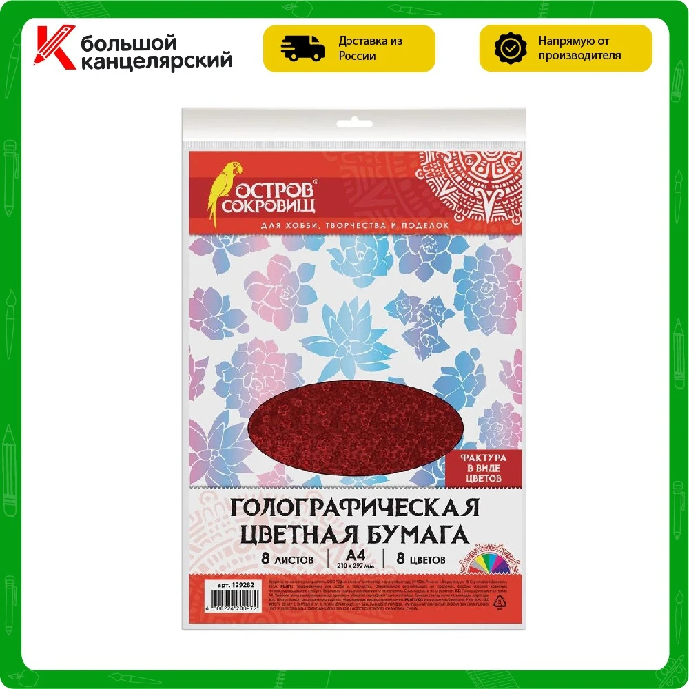 Голографическая цветная бумага А4 Остров Сокровищ цветы, 8 цветов