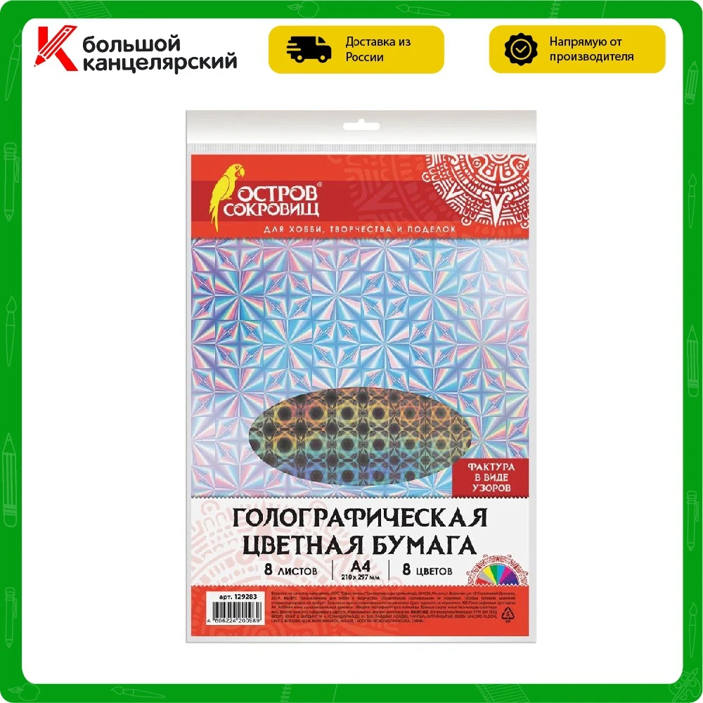 Набор цветной бумаги для учебы и творчества ОСТРОВ СОКРОВИЩ пригодится в моделировании, оформлении плакатов, создании аппликаций и поделок.Набор голографической односторонней цветной бумаги плотностью 80 г/м2 включает 8 листов формата А4 (210х297 мм) в 8-ми разнообразных и насыщенных однородных цветах. Листы упакованы в полиэтиленовый пакет с липким краем, легко режутся и сгибаются. Цветная бумага незаменима при создании аппликаций, поделок и открыток. Помочь создать первые шедевры помогут товары для детского творчества ОСТРОВ СОКРОВИЩ, которые без труда можно заказать в нашем интернет-магазине за считанные секунды!• Тип бумаги: голографическая.• Плотность бумаги: 80 г/м2.• Формат: А4.• Количество листов: 8.• Количество цветов: 8.• Прокрас бумаги: с 1 стороны.• Ширина: 210 мм.• Длина: 297 мм.• Обложка: мелованная бумага.• Упаковка: пакет.• Артикул производителя: 129283.