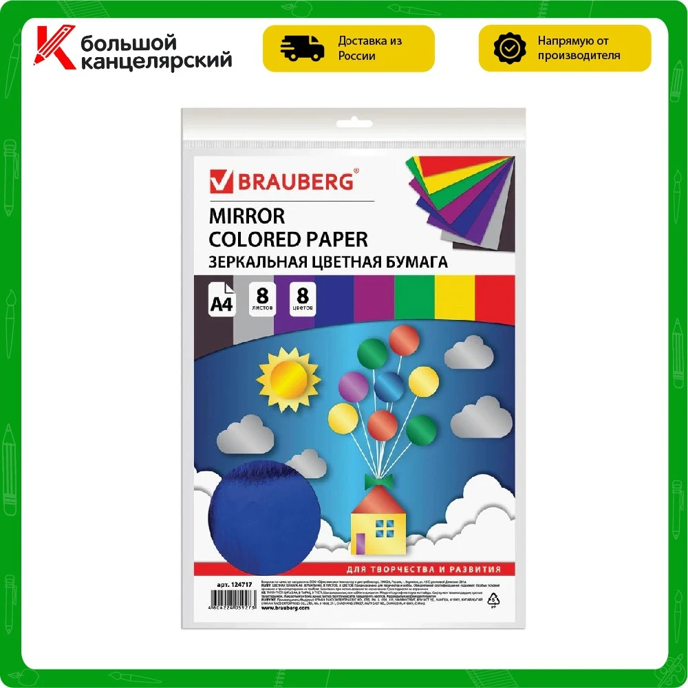 Зеркальная цветная бумага А4 Brauberg, 8 цветов
