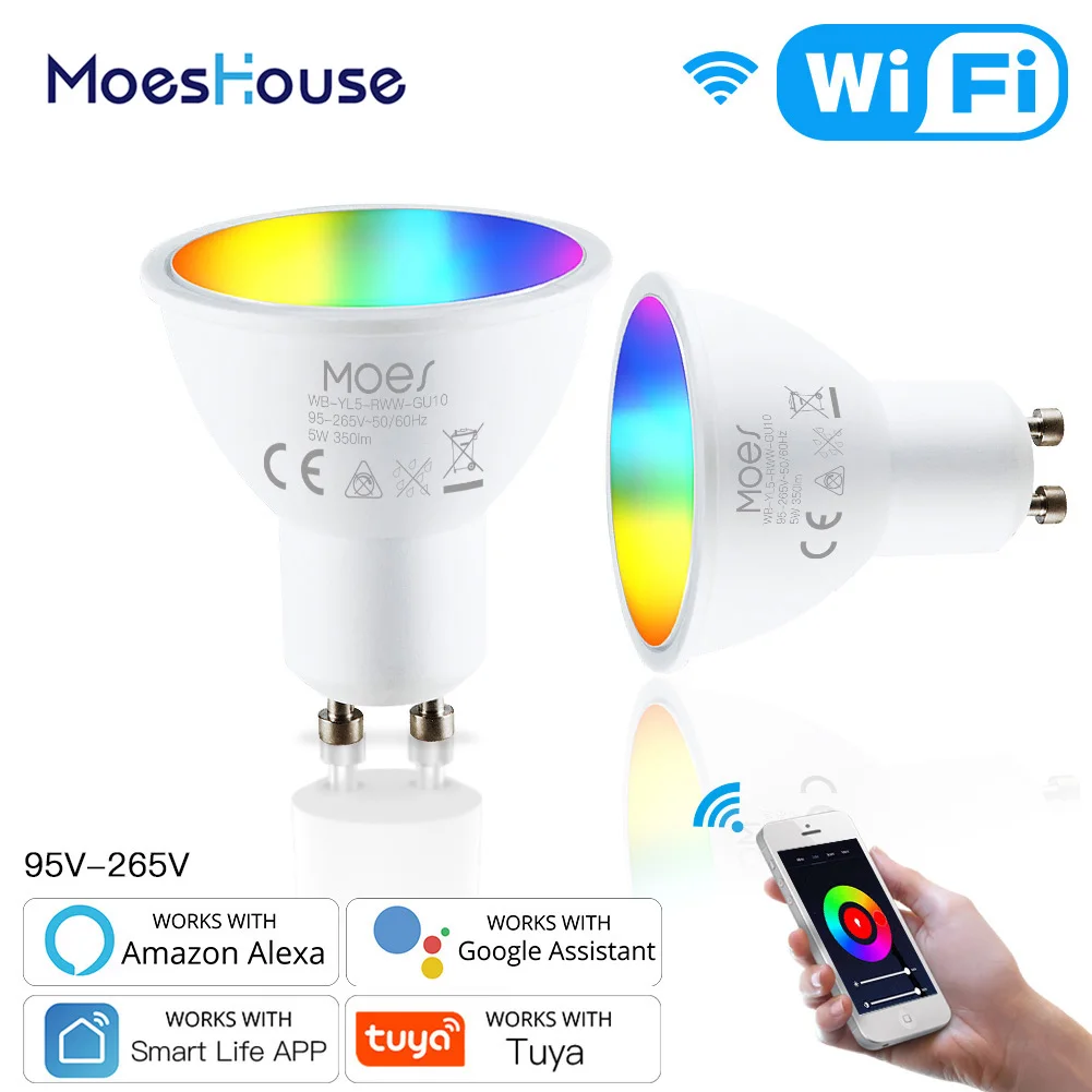GU10 WiFi Смарт светодиодный лампы RGBCW2700-6500K C + W белый5 ламп с регулируемой яркостью Smart Life Tuya APP светильник с пультом дистанционного управления лампы работают с Alexa/Google 90-250 V от MoesHouse