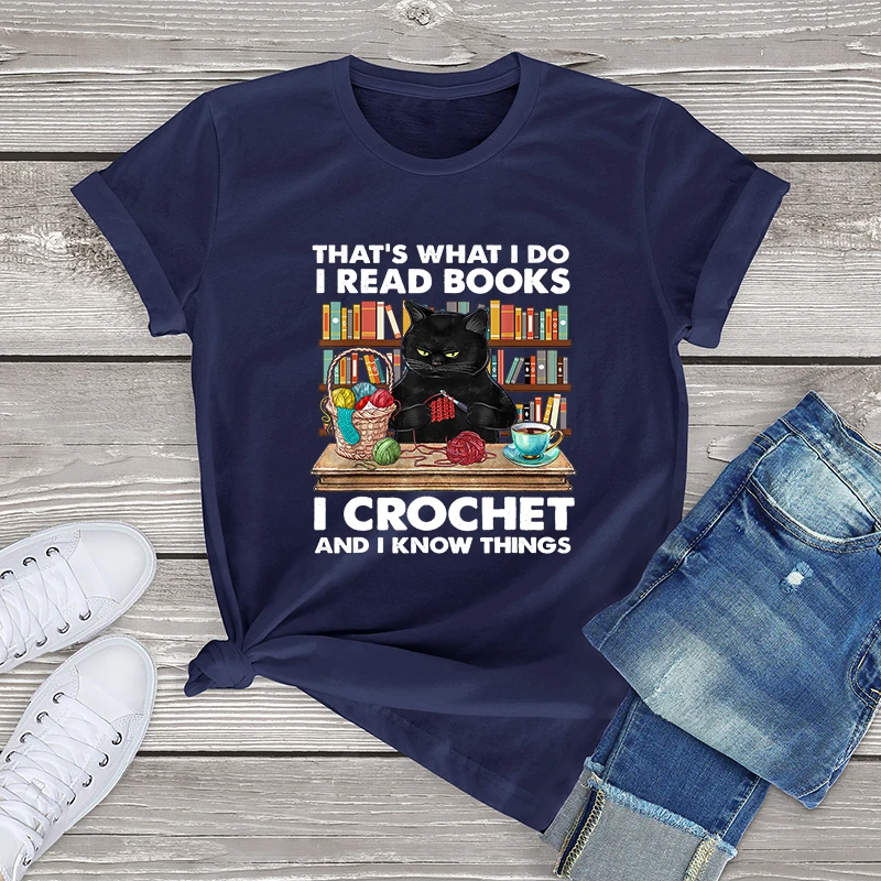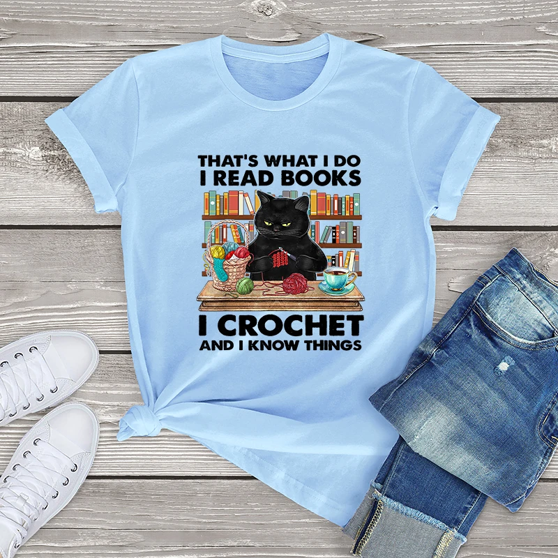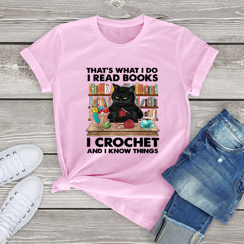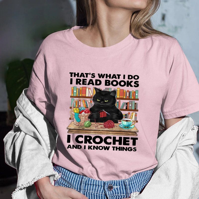 Забавная футболка с черным котом, женская одежда, вот что я делаю, я читаю книги, вязание крючком, и я знаю вещь, принт, аниме, рубашки, модные топы