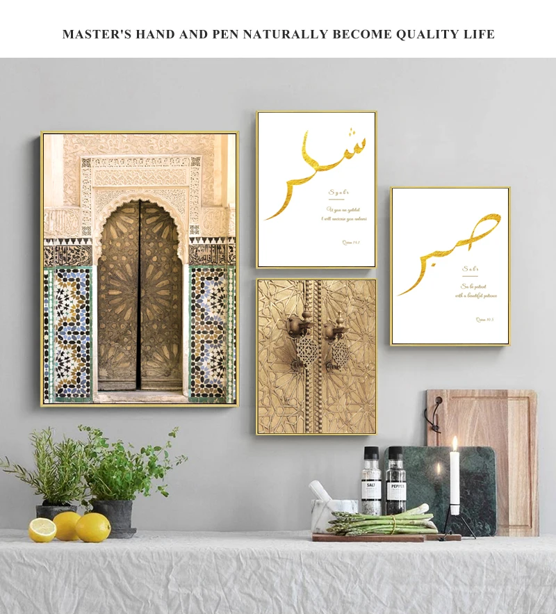 Исламский плакат, печать на холсте, мечеть, марокканская дверь, настенная живопись, Коран, цитата, Современный домашний декор, художественная картина для домашнего дизайна