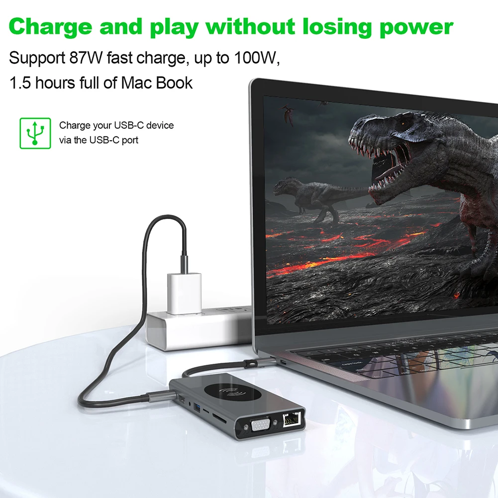Спецификация:Входной разъем: USB Type-CВыходной порт: 1 x USB Type-C PD зарядный порт3 порта USB 3.0 типа A4 порта USB 2.0 Type-A1 x Безопасный слот для цифровой карты1 слот для tf-карты1 порт RJ451 x HDMI порт1 порт VGA1 х Беспроводное зарядное устройство1x3,5 мм аудио разъемРазрешение: 4K HDMI, 1080P VGAСетевая карта RJ45: Поддержка 100/1000M EthernetБеспроводной Зарядка: 5 Вт/7,5 Вт/10 ВтPD мощность: 87 Вт (100 Вт макс.)Материал кабеля: ПВХМатериал сердечника: луженая медная проволокаДлина кабеля: 15 см/5,91"Основной материал: алюминиевый сплав и АБСРазмер изделия: 12*6,3*1,9 см/4,72*2,48*0,75"Вес изделия: 142 гРазмер упаковки: 17,6*9,6*2,6 см/6,93*3,78*1,02"