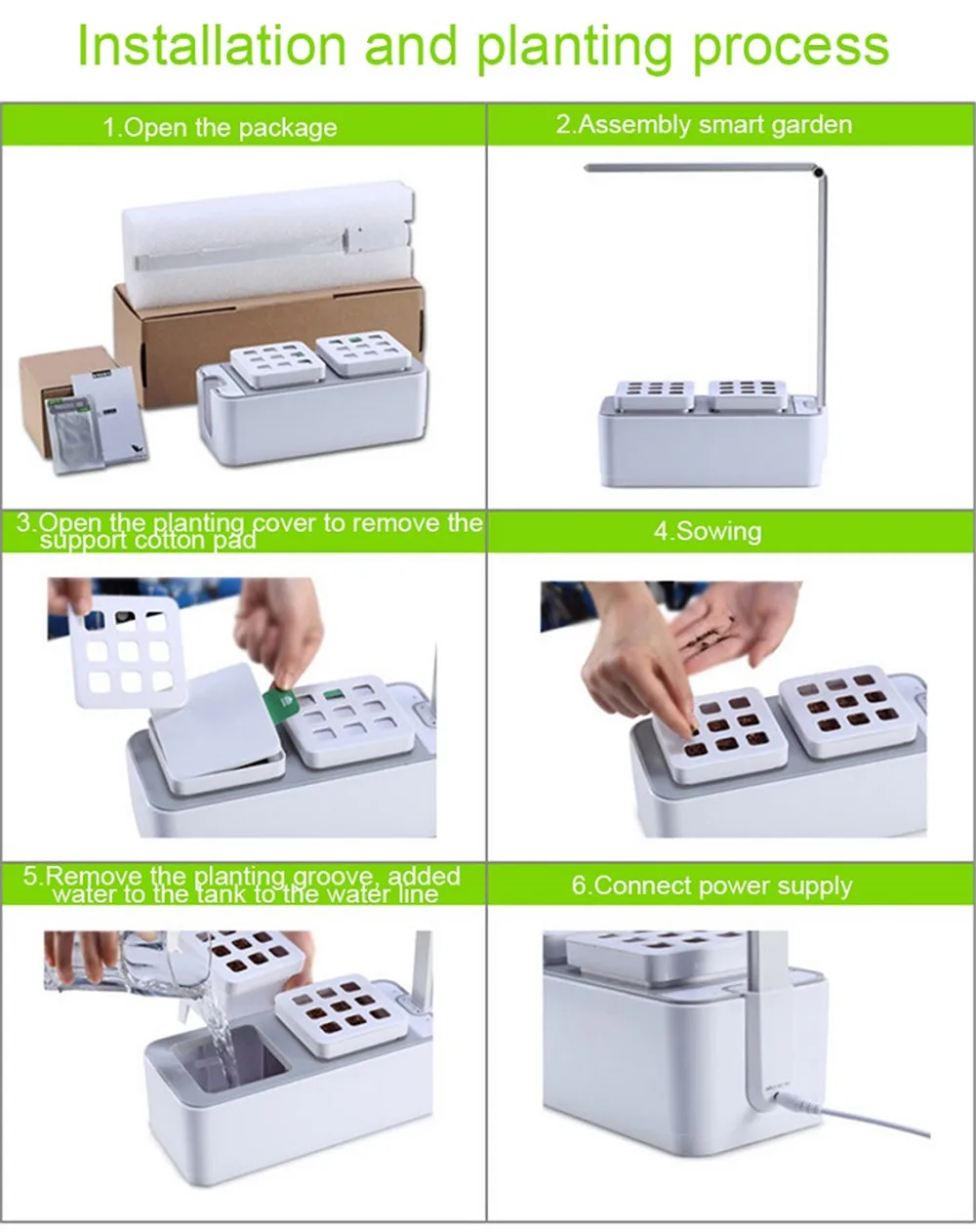 1. Многофункциональный: умный садовый светильник с травами, встроенный светодиодный светильник 3 цветов (белый, красный, синий), также может использоваться как светодиодный светильник для чтения.2. Как лампа для чтения: белый светодиодный светильник с 3 уровнями яркости регулируется, предназначен для ночного чтения.3. Как посадка лампы: под посадки режим, в ней есть функция автоматического таймера: 16 часов освещения и 8-часовой отдых.4. Регулируемый светильник ing угол: Светодиодный Светильник Руки может быть горизонтально поворачивается 360 ° и вертикально поворачивается в 180 ° для наиболее подходящим для заполнения светильник ing.5. Продвинутая посадка гидропоники: без загрязнения почвы, меньше вредителей и заболеваний, без беспорядка. Растения растут под контролем, обеспечивая более быстрый рост.6. Специальная посадочная среда: поставляется с 2 пакетами вермикулита, которые могут содержать воздух, воду, питательные вещества и увеличивать скорость прорастания, более полезны для растений.7. Высокая производительность: в соответствии с спектром солнечного светильник, мы используем специальный светодиодный светильник, который обеспечивает светильник для растений, который может максимизировать фотосинтез для быстрого и естественного роста.8. Напоминание о нехватке воды: знак водной линии и Встроенный сигнал тревоги воды, чтобы напомнить вам о одновременном добавлении воды. Если у вас нет воды, загорится красный светильник, и машина начнет звуковой сигнал.9. Отличный выбор посадки в помещении: приличный размер, красивый и аккуратный дизайн делают его идеальным для гостиной, кухни, офиса и т. д.