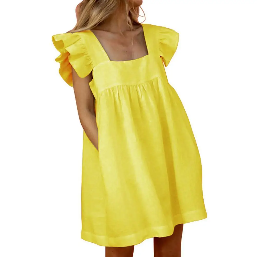 Новинка 2021, женское модное Повседневное платье с квадратным вырезом, Желтое Белое свободное мини-платье без рукавов с лямки с оборками карманами