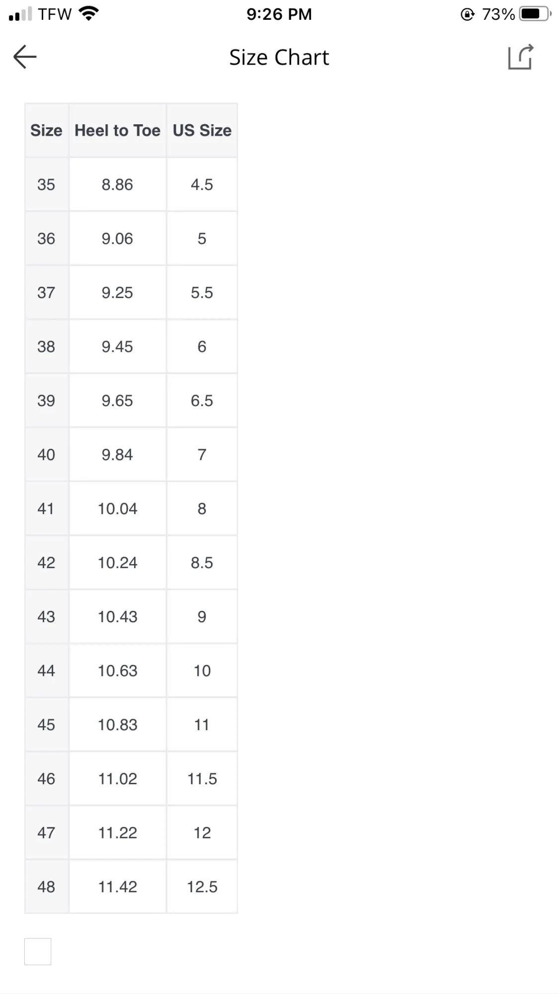 Размеры неточны, сверху есть две совершенно разных таблицы. Продавец отказывается вернуть мне деньги или отправить замену обуви нужного размера. Aliexpress двусторонний с продавцом, поэтому я не $32 и у меня есть обувь, которая на два размера больше. Общее количество отходов! Расскажите всем, что я знаю об услугах, которые я получил от этого продавца и Aliexpress. Больше не буду покупать здесь.