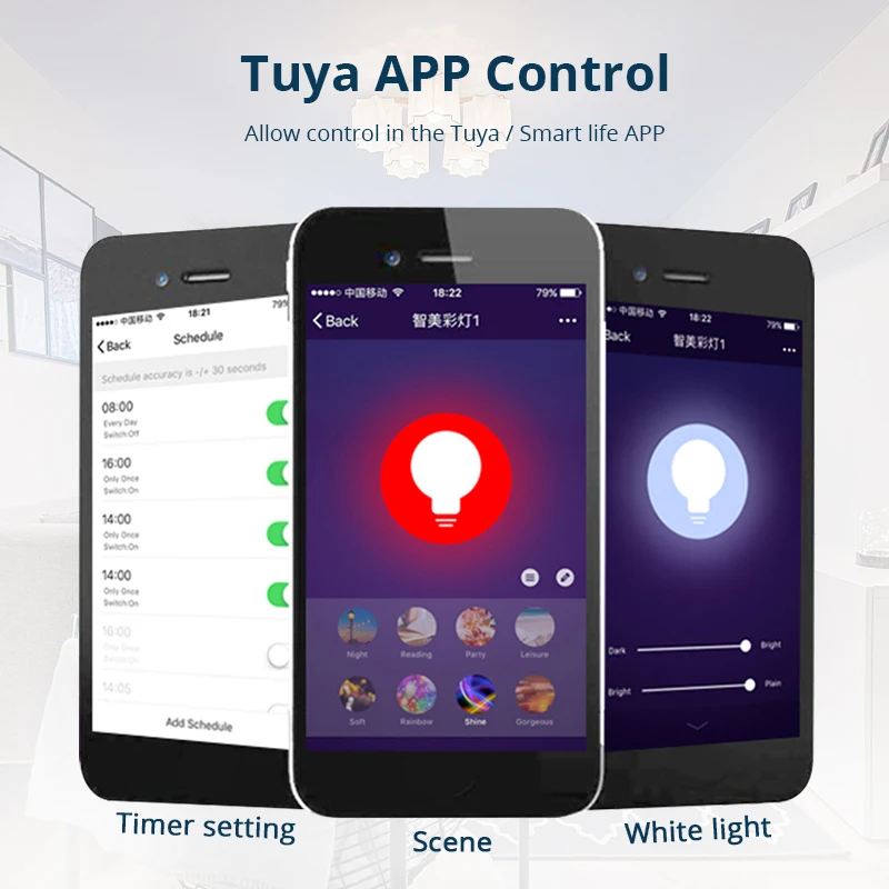 -Поддержка 2,4g wifi управления-Простая установка, хорошо работает-Упростите свою жизнь: у него есть функция дистанционного управления, управляемая приложением-Tuya (бесплатно) на вашем телефоне. Поэтому вам никогда не нужно выходить из теплой кровати или сиденья, чтобы выключить светильник.-Радуга цветов: Цветовая температура светильник от 2000k до 9000k. Более 16 миллионов цветов на ваш выбор, и все они являются регулируемыми. Вы можете легко установить цвет, чтобы соответствовать вашему настроению с регулируемой яркостью-Не требуется оттенок, отлично работает с Alexa и Google Home, так что вы можете легко включать/выключать лампу, регулировать цветовую температуру или яркость только своим голосом.-Просыпайтесь с вашим любимым светильник: с функцией таймера, он может быть настроен для включения с вашим любимым светильник утром, когда ваш обычный сигнал тревоги выключается.-Обмен: обмен устройствами с вашими семейными мужьями. Для этого вы можете наслаждаться высококачественной жизнью с семьей-Групповое управление: Добавьте несколько устройств в группу. Для этого вы можете управлять ими вместе за один раз. Вы можете создать группу для всех ваших умных устройств и контролировать их все в одной команде.