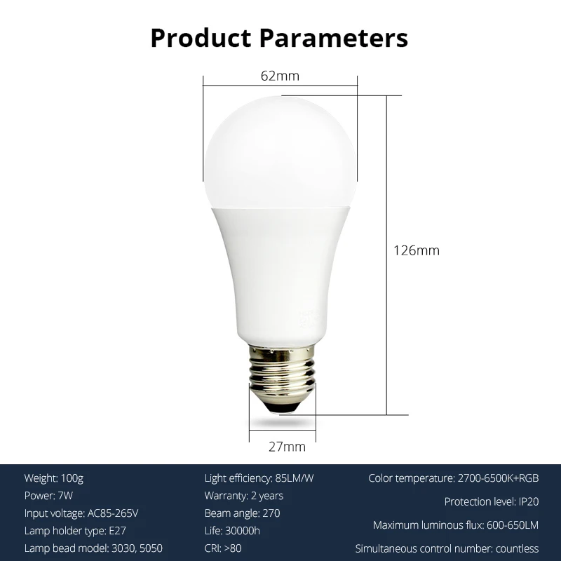 Размер: 62*126 ммВес: 100 гМощность: 7 ВтВходное напряжение: AC85-265VТип цоколя: E27Светильник эффективность: 85LM/WМаксимальный световой поток: 600-650LMУгол луча: 270Срок службы: 30000 чCRI: >80Цветовая температура: 2700-6500K + RGBУровень защиты: IP20