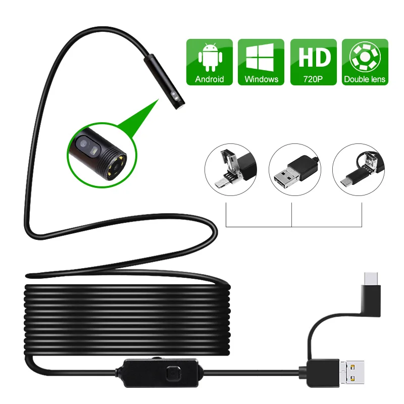 8,0 мм USB эндоскоп Двойной объектив 720P HD промышленный бороскоп 3-в-1 6 светодиодов Гибкие Камера 2MP высокой четкости для Android ПК