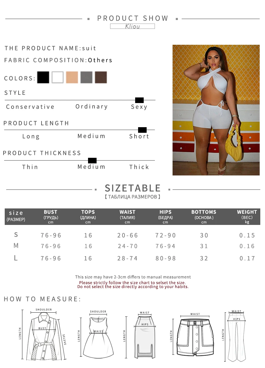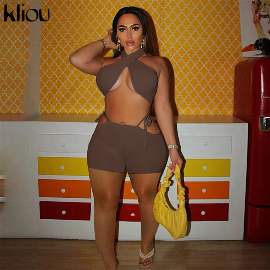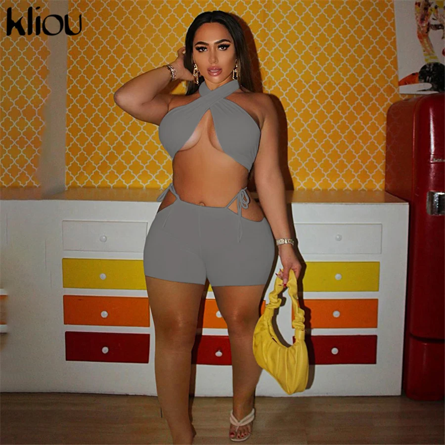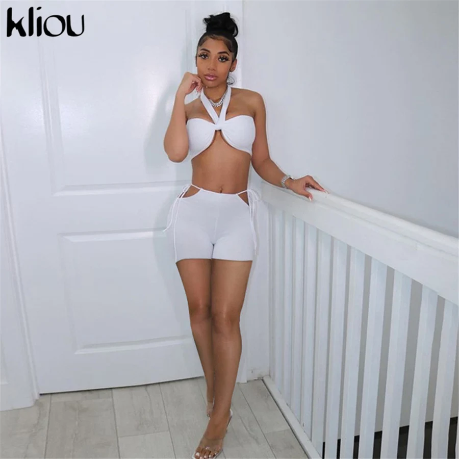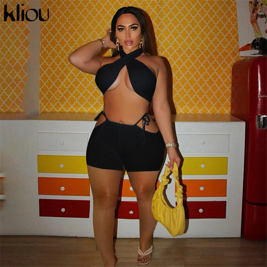 Kliou бандаж крест-накрест однотонный комплект для женщин 2021 открытая спина клубный кроп-топ и шорты Комплект из двух предметов Сексуальные облегающие костюмы