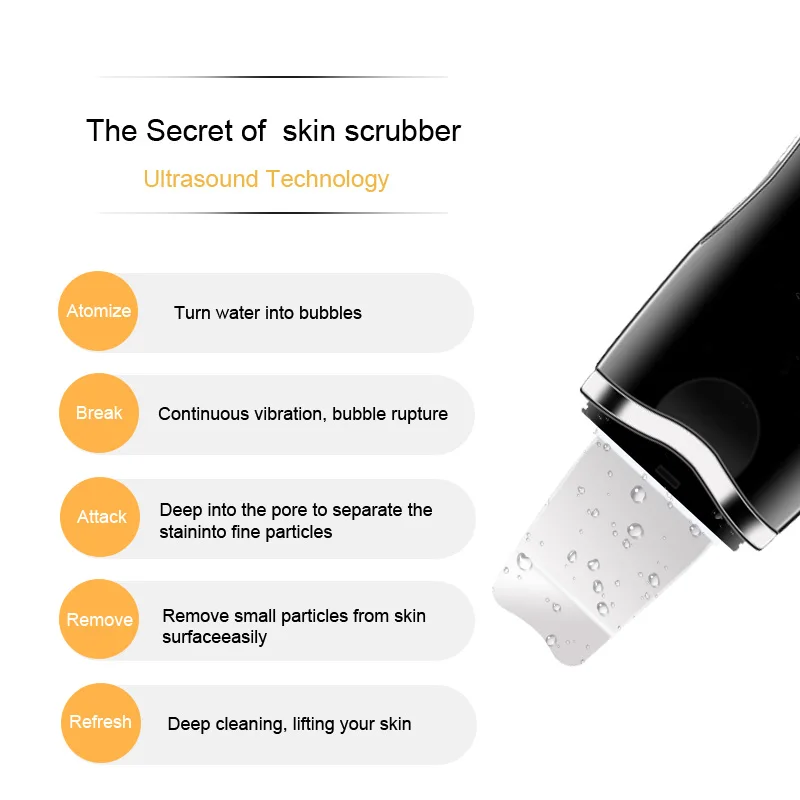 Супер тонкий и компактный внешний вид, эргономичная обтекаемая ручка, удобный интерфейс и сенсорный экран, такой дизайн сделан для вас, чтобы использовать его более легко и удобно.Доступны 3 режима работы: очищение, увлажнение и лифтинг.Принимает ультразвуковую волну и нанотехнологию, сочетая с уникальным зондом типа лопаты и высокочастотной вибрацией, она может глубоко проникать в кожу лица.Многофункциональный. Ультразвуковая Вибрация 24000 Гц в секунду. Импорт аниона облегчает удаление грязи с вашей кожи и проникает в питательный раствор. Этот косметический инструмент может проникать в глубину кожи, глубоко очищать кожу от грязи и вводить питательный раствор, который может улучшить микроциркуляцию, драги потовых желез, сужает поры и помогает решить многие проблемы с кожей.Удобная перезаряжаемая конструкция и долговечность. Его можно непрерывно использовать в течение 3-4 дней после полной зарядки.2. Три режима:Режим очищения: его вибрационная технология глубоко проникает в поры кожи и удаляет грязь, омертвевшие клетки кожи, масло и следы макияжа. (Держите кожу влажной при использовании).Режим увлажнения: нанесите ваш любимый увлажняющий крем или маску на кожу и используйте это устройство, чтобы помочь им глубоко впитаться в кожу и массировать кожу.Режим лифтинга: использование антивозрастного крема на лице с помощью этого устройства помогает уменьшить морщины, затянуть кожу, улучшить контур лица и повысить циркуляцию крови.3. Примечание:A. Не используйте это устройство вокруг глаз, поврежденной кожи, дерматита, вызванного косметикой, акне воспаленных частей, или реформирующих частей.B. Это устройство будет иметь низкий уровень шума из-за ультразвуковой вибрации, это нормальное явление, пожалуйста, не стесняйтесь использовать.C. Помните, что это устройство должно использоваться с кремом для кожи или жидкостью, вы не можете использовать его в сухих условиях.D. Дети, беременные женщины и больные тяжелыми сердечными заболеваниями не могут использовать это устройство.Е. Пожалуйста, держите руки сухими при использовании этого устройства, в противном случае источник питания может быть коротким.F. После использования протрите зонд сухой тканью и дезинфицируйте его спиртом.Г. Перед использованием этого устройства очистите кожу при помощи деликатной стирки или воды (Держите кожу влажной)H. Правильное время работы составляет около 2-5 минутI. Пожалуйста, не используйте устройство повторно на той же области кожиJ. Глубокое очищение и увлажнение будут более эффективны, когда вы держите металлическую планку на обеих сторонах устройстваK. Жирная и нечувствительная кожа: 2-3 раза в неделю; Сухая/Комбинированная и чувствительная кожа: 1-2 раза в неделюL. Избегайте чувствительных зон на вашей коже. Избегайте области губ и глаз4. Спецификация:Материал: АБС-пластикМощность: 2 ВтВремя зарядки: около 2,5 часовВремя использования: 80 минутРежим зарядки: перезаряжаемая литиевая батареяВес: 115 г5. Посылка1 x ультразвуковой скруббер для лица1 х USB кабельЗащитная крышка-1 шт.Руководство пользователя (на английском языке)-1 шт.