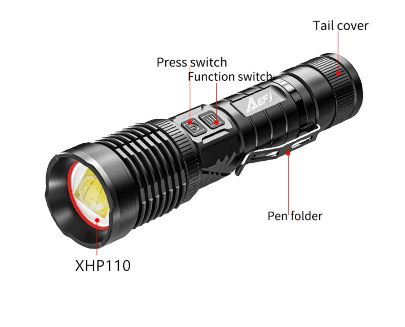 1. Название бренда: AEFJ X72. Бусины: XHP1103,3-режимы: верхний свет, нижний свет, флэш-память4. Срок службы лампы: 100000 часов5. Цвет Фонарика: черный6. Излучаемый Цвет: белый светильник7. Переключатель: кнопочный переключатель8. Чехол Материал: Прочный авиационный алюминий9. Расстояние освещения: более 200 метров10: светодиодный срок службы: более 100000 часов
