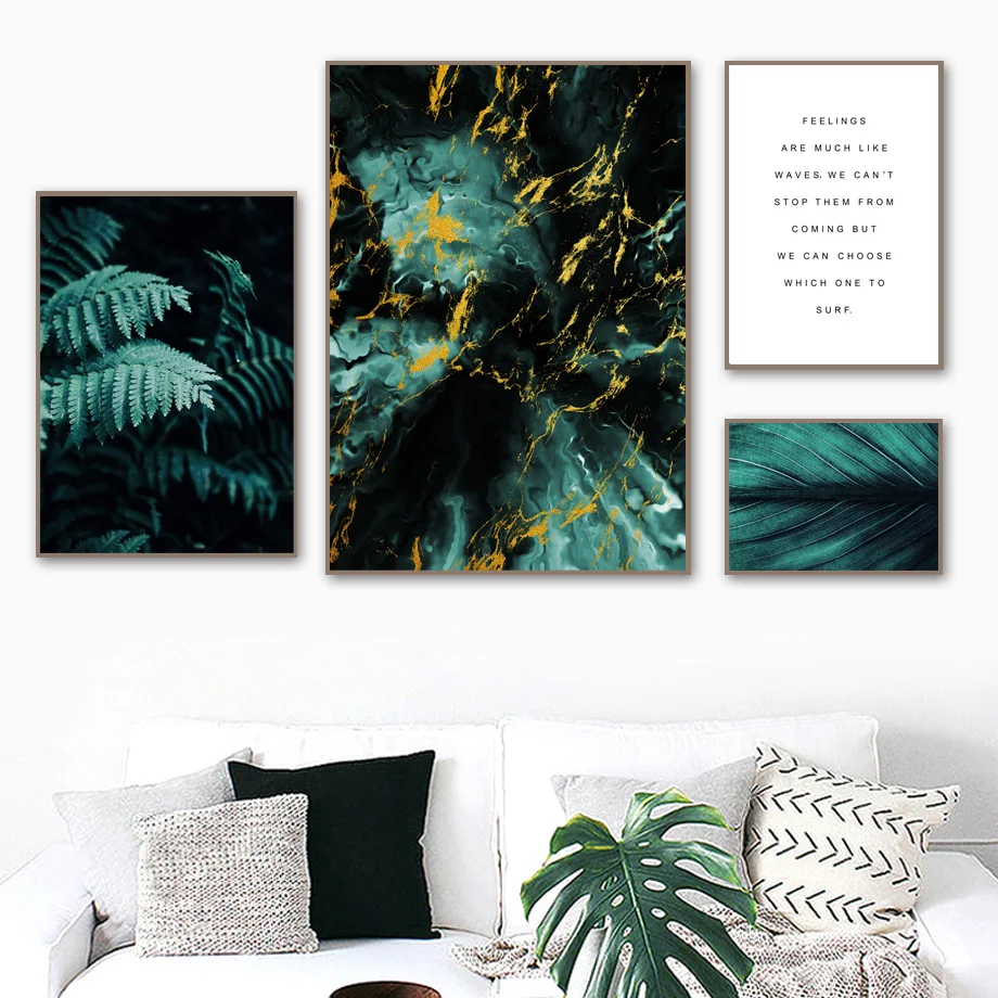 Зеленые папоротники, листья, мраморные облака, цитаты, скандинавские постеры и принты, настенная Картина на холсте, растения, настенные картины для декора гостиной