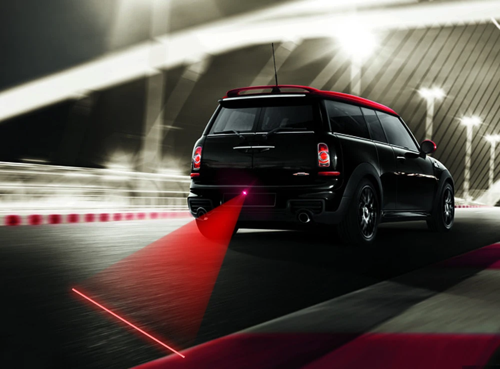 Новейшая разработка лазерных противотуманных светильник р проходит через установку красного лазерного передатчика в задней части автомобиля для проецирования лазерного луча через воздух на землю в дождь и туман. Его легче найти, чем у традиционных противотуманных светильник р, и проникающая способность у них сильнее. Может напоминать транспортному средству о безопасном расстоянии. Лазерный луч стреляет вниз с определенным углом наклона, чтобы гарантировать отсутствие прямого воздействия на глаза. Откройте светильник в солнечную погоду, чтобы увидеть только красную линию, проецируемую на земле, не нужно беспокоиться, что он защитит номерной знак автомобиля.