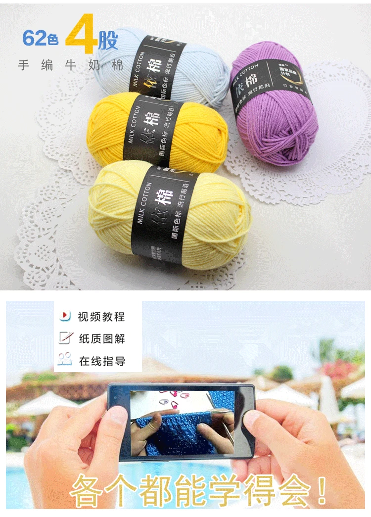 Название: 4 нити из молочного хлопкаВес: 50 гТолщина: средняя толщинаМатериал: 100% акрилПроцесс прядения: компактное прядениеКоличество пряжи: 11SИгла предложение: Эта модель имеет игла стержня 3 мм, вязанная крючком иглы 2,5-3 ммОсобенности: мягкие, удобные, можно носить близко к коже, против морщин, термоусадочные, теплые, прочные, натуральные, подходят для детей, подходят для людей всех возрастов