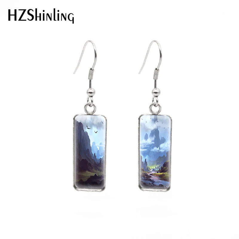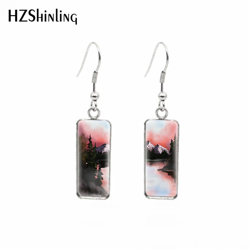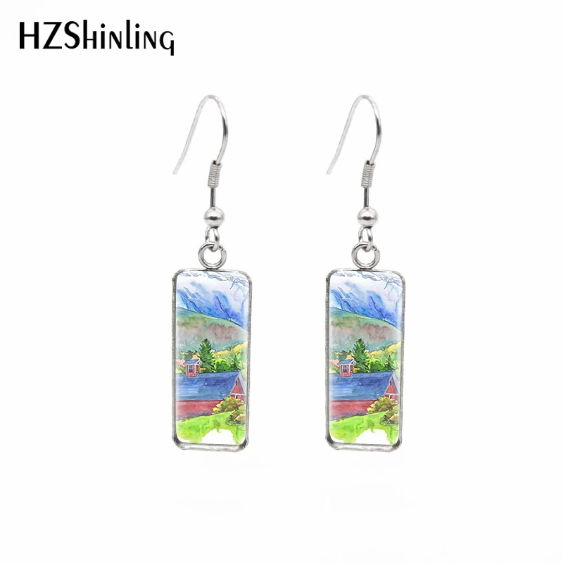 Новинка 2021, прямоугольные серьги с пейзажем гор и долины, художественные серьги-Крючки с рисунком рыбы, стеклянный кабошон, ювелирные изделия ручной работы