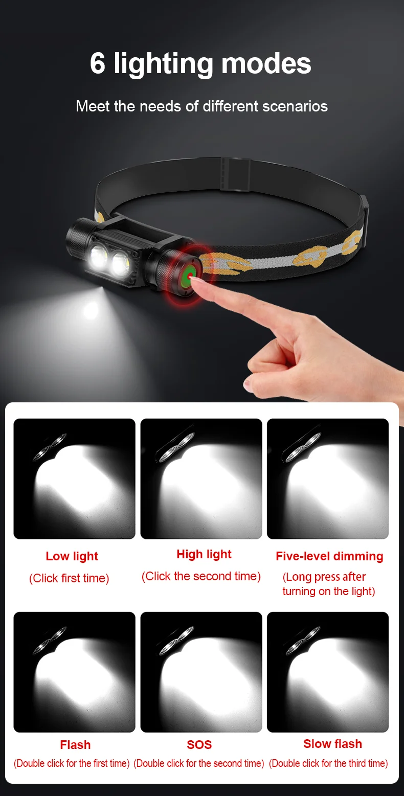 Руководство по эксплуатацииНовейший светодиодный светильник COB s использует 2 * COB для повышения яркости источника света светильник4 режима: сильный/слабый/вспышка/COB(Прост в использовании в различных ситуациях)3 * AAA аккумуляторная батарея, сильный Срок службы батареиПоля шляпы могут блокировать дождь; Цвет может быть изменен(Регулировка на 90 °, контроль угла наклона на светильник)Соответствует IPX-4 стандарту водонепроницаемости, может использоваться в дождливые дни, но не может быть помещен в водуМаленький и милый, легко носить с собой, может использоваться как фонарик или фараПовязка на голову может растягиваться и регулироваться в соответствии с размером головы. Легко надевать или сниматьПредназначен для работы, охоты, разведки, безопасности, рыбалки, езды на велосипеде, поиска и спасения