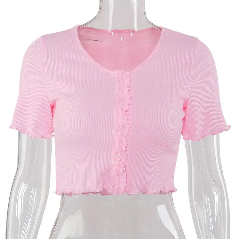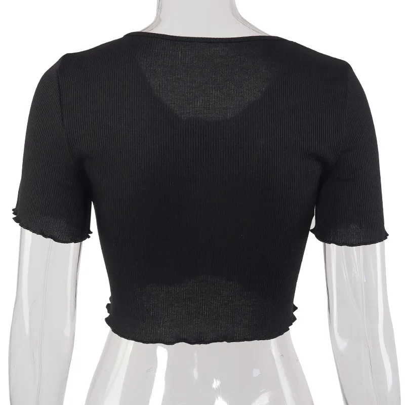 Женский укороченный топ на пуговицах, однотонный трикотажный топ с коротким рукавом и V-образным вырезом