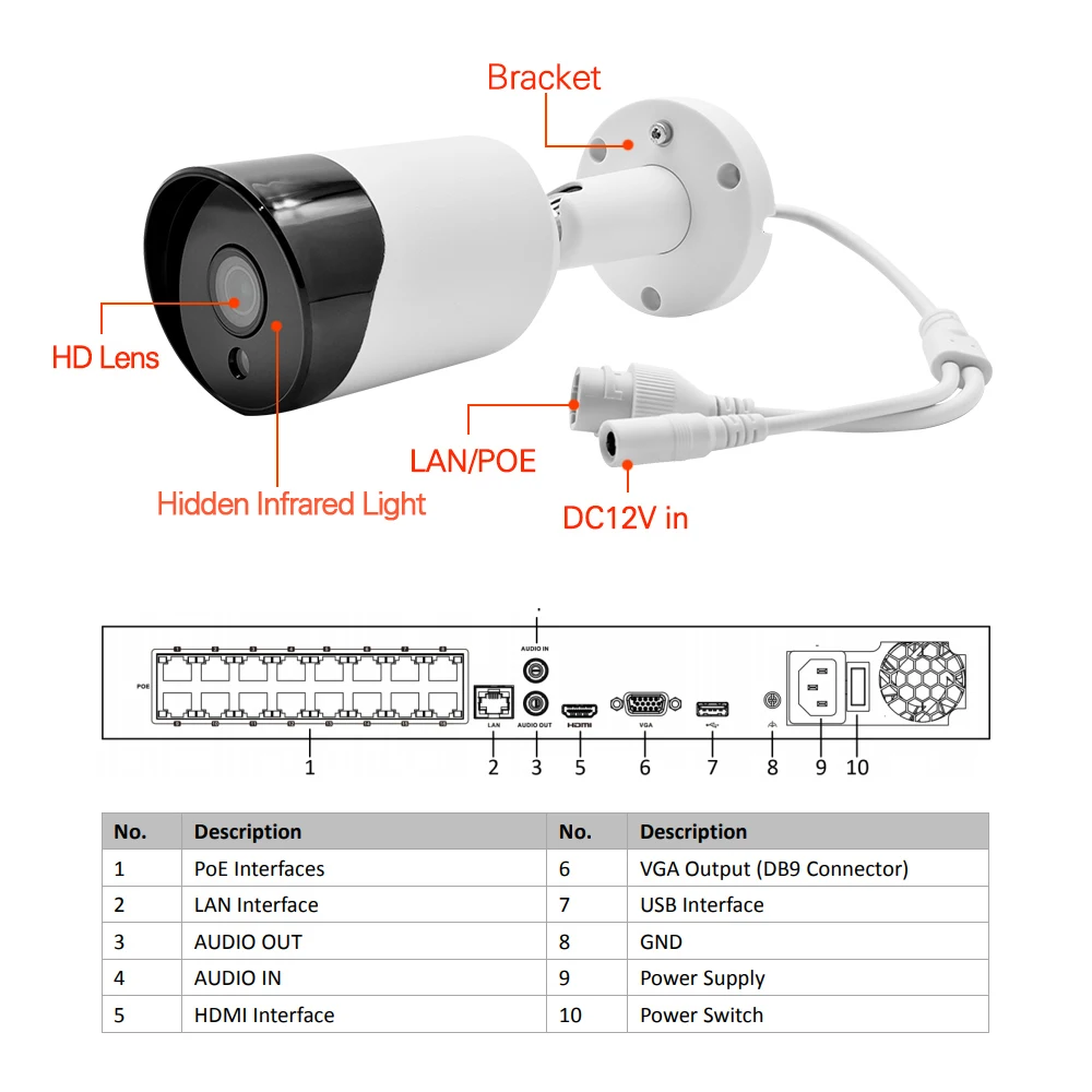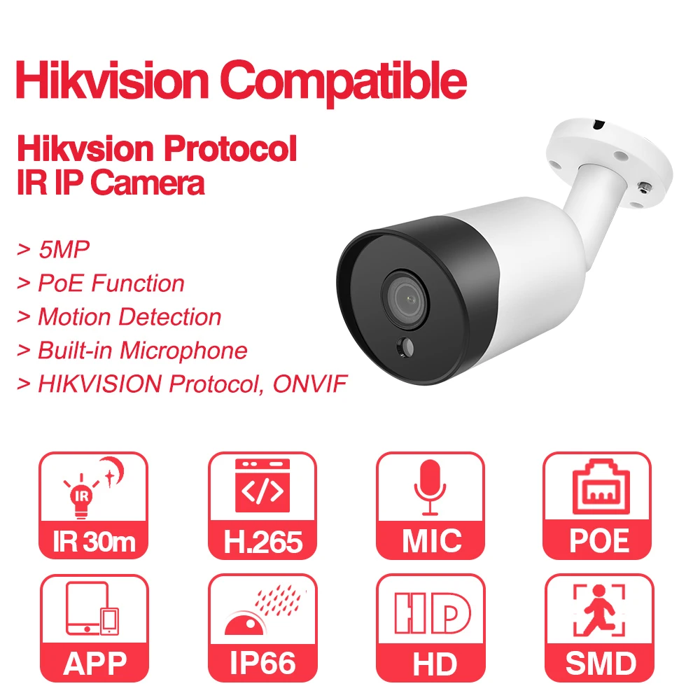 IPC:PG2055IHikvision compatible 5MP IP camera> Day/Night(ICR), Ultra DNR> MAX. 15fps 5MP(2592 × 1944),25fps 4MP(2560x1440)25fps 3MP> H.265/H.264 dual-stream media server> Compatibility: HIKVISION,ONVIF,RTSP> Multi web browser, PC Client, mobile APP remote access> Support PoE> IP66 waterproof> built-in MIC
