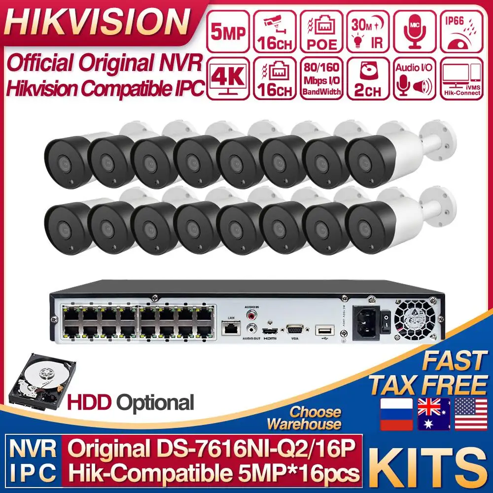 Hikvision совместимые наборы DS-7616NI-Q216P 16POE NVR и 5-мегапиксельная IP-камера Bullet POE 30M IR Встроенный микрофон 16 шт. Plug play система видеонаблюдения