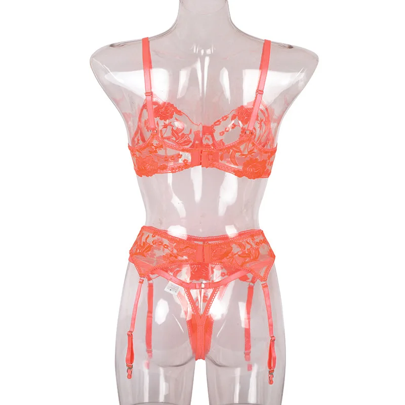 Новинка, женское Прозрачное нижнее белье, комплект из трех предметов, сексуальное кружевное нижнее белье с вышивкой