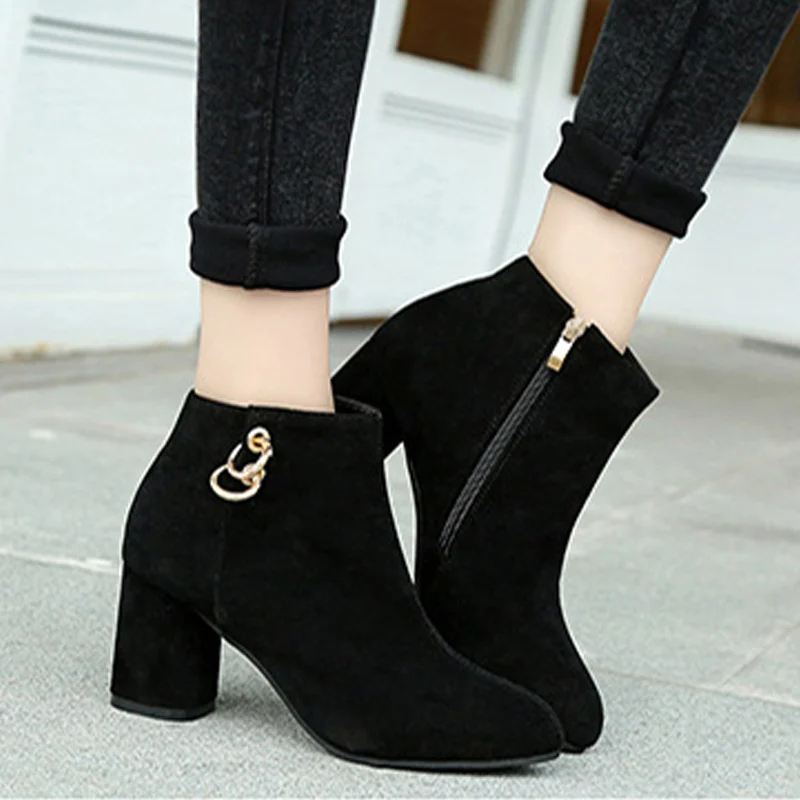 Женские ботинки без шнуровки с острым носком на высоком каблуке, женские лаконичные зимние уличные ботинки с металлическим украшением, женская обувь