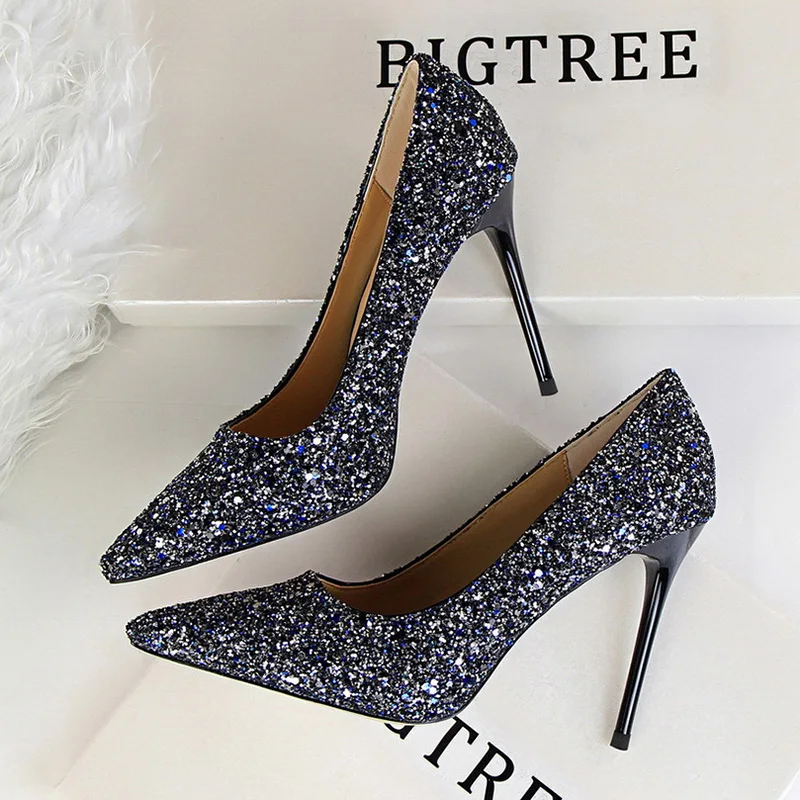 Женские туфли на высоком каблуке с острым носком и блестками
