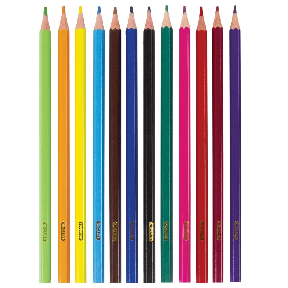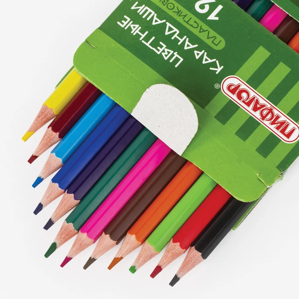 Набор состоит из 12 цветов: розовый, красный, желтый, оранжевый, салатовый, зеленый, голубой, синий, фиолетовый, коричневый, серый, черный. Шестигранная форма сечения корпуса позволяет карандашу не скатываться с поверхности стола во время занятий рисованием.