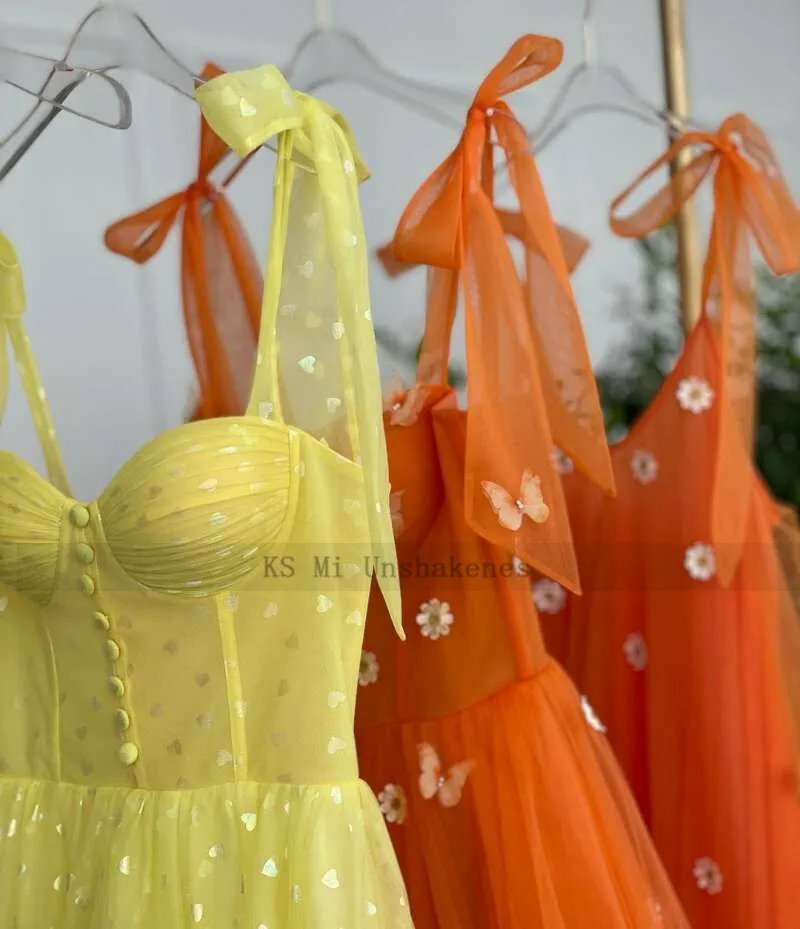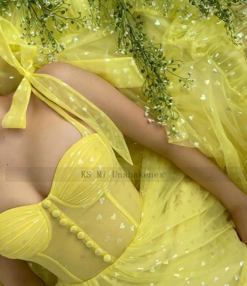 Платье для выпускного вечера из тюля, ТРАПЕЦИЕВИДНОЕ ПЛАТЬЕ цвета лимоно-желтый с бантом на бретелях, на пуговицах, длиной до щиколотки, Формальные вечерние платья, 2021