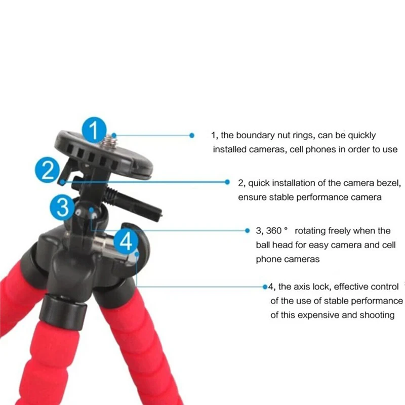 1. Полная гибкость, изготовлен из жесткого пластика2. Серые Прорезиненные кольца, ножки и соединительная подушка3. Соединительные винты в большинство размеров цифровой камеры и съемные4. Съемное соединение с кнопкой блокировки5. Позволяет ему выровнять камеру на самых неровных поверхностях6. Вес: 80 г7. Размер: 150x35x35 мм8. Товар может поддерживать максимум 275 г9. Цвет: синий/красный/черный
