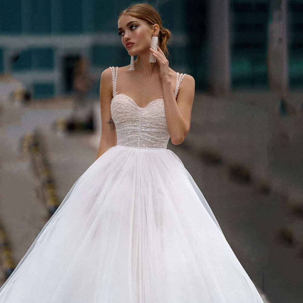 Женское кружевное свадебное платье, привлекательное ТРАПЕЦИЕВИДНОЕ ПЛАТЬЕ до пола из тюля на бретелях-спагетти с бисером, платье для невесты