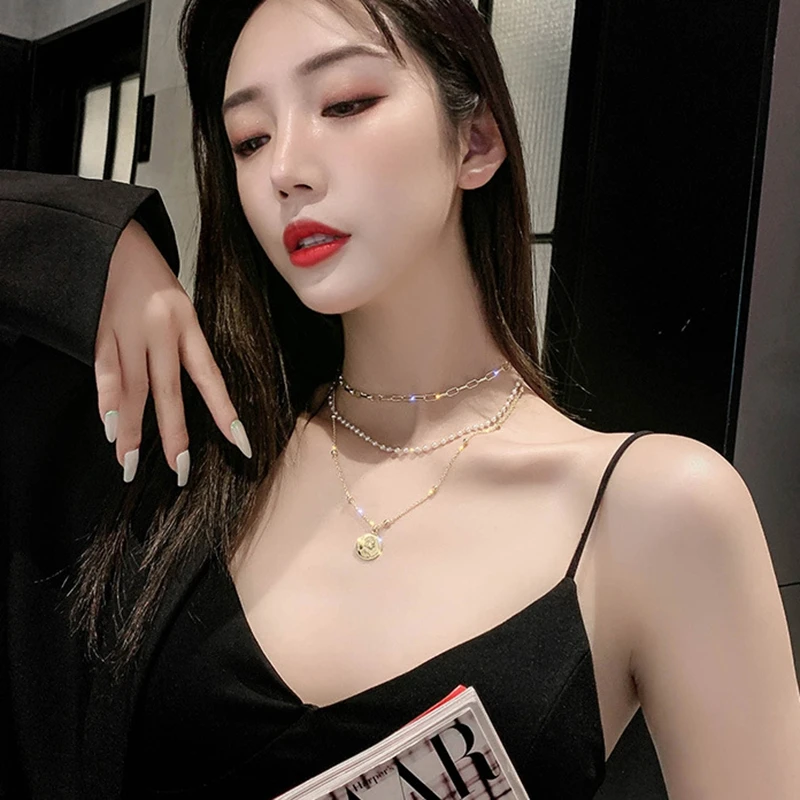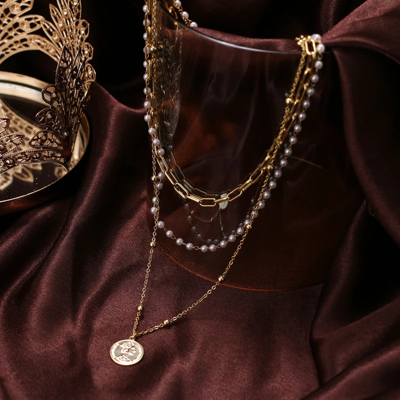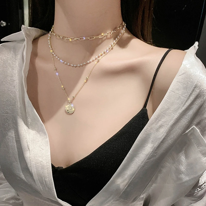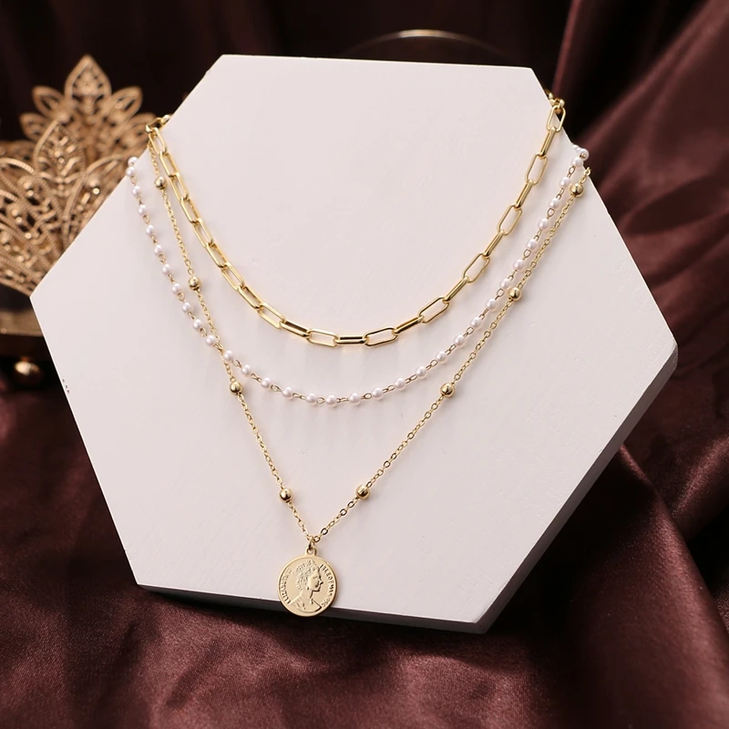 IFKM в стиле панк с многослойной жемчужное колье воротник себе Девы Марии монета металлической подвеской и украшениями в виде цепочек и кругов из бисера ожерелье для женщин подарок