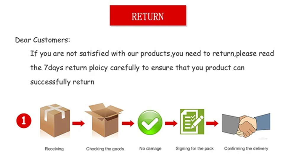 1. Если ваше время подтверждения приближается, и вы все еще не получили посылку, пожалуйста, свяжитесь с нами. Мы продлим срок доставки. 2. Если через 60 дней вы все еще не получили pacle, пожалуйста, свяжитесь с нами, чтобы решить эту проблему. Мы предоставим вам решение satistactory. 3. Никаких споров, пожалуйста: Пожалуйста, не применяйте спор в течение 60 дней. Я считаю, что все может быть решено путем общения. . Давайте поддерживать хорошие деловые отношения!