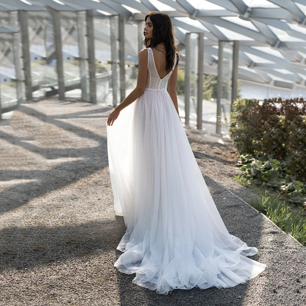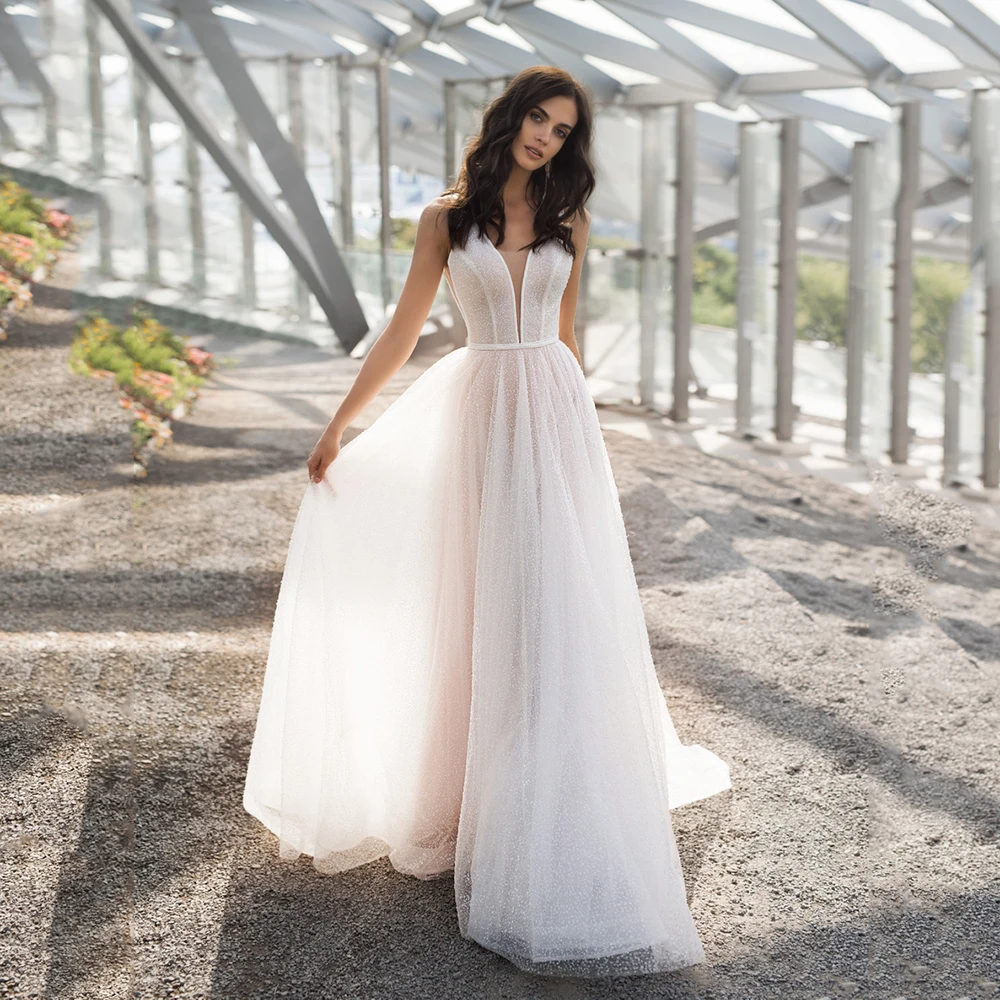 UZN Элегантное свадебное платье А-силуэта с V-образным вырезом, без рукавов, блестящее фатиновое платье невесты с драпированной юбкой и поясом с бисером